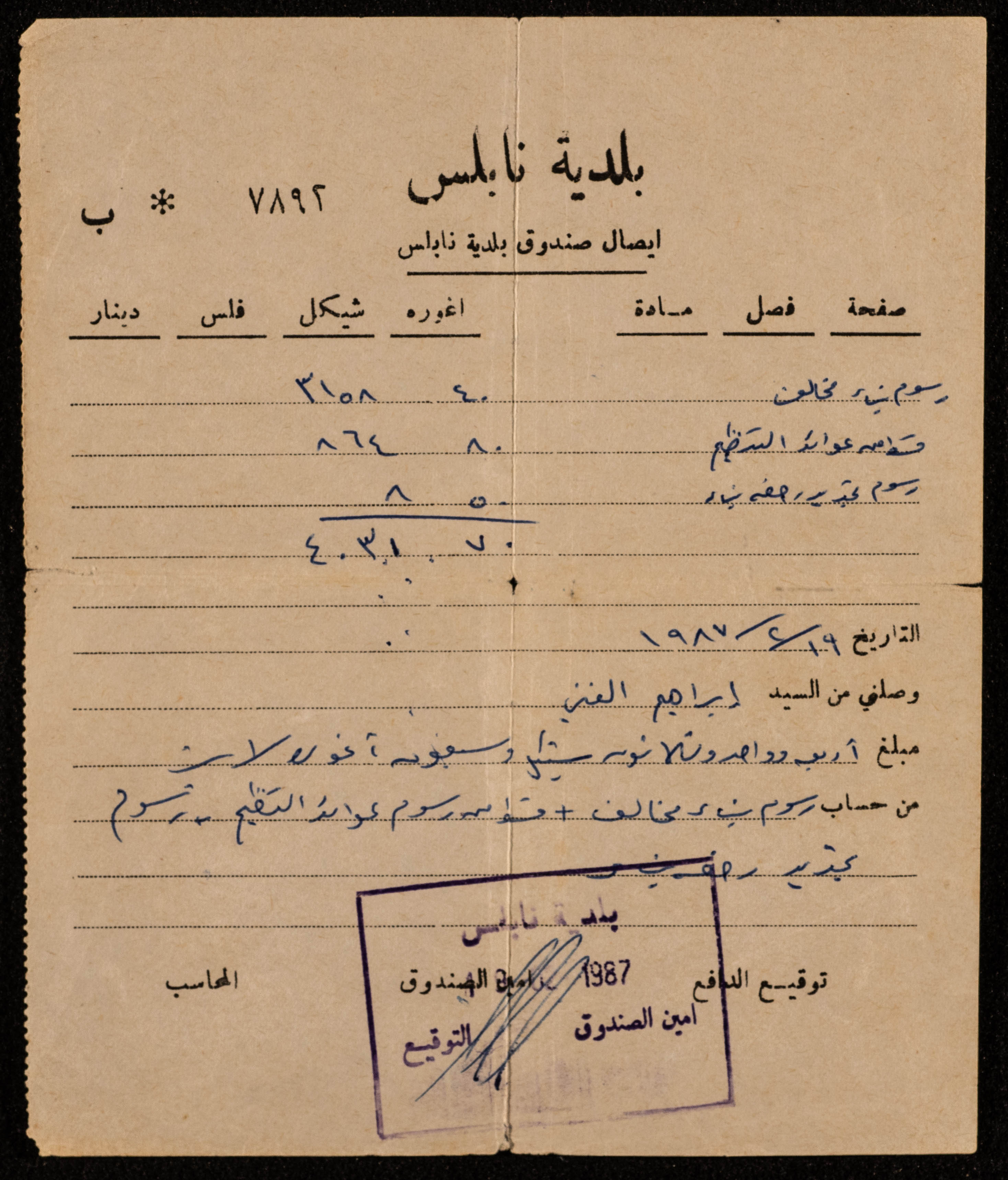 "إيصال صندوق بلدية نابلس"، 19 شباط 1987