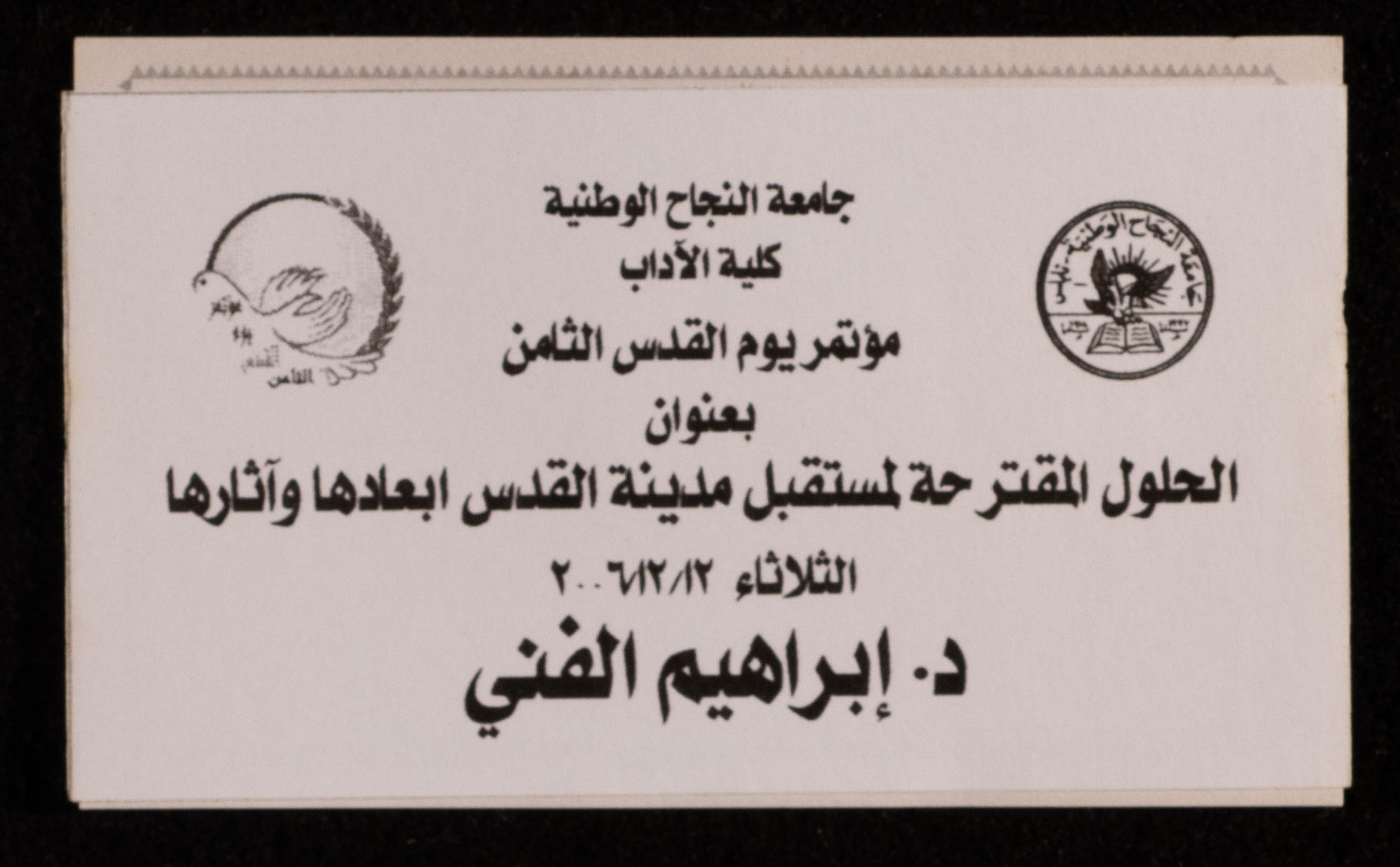 بطاقة مشاركة إبراهيم الفنّي، في مؤتمر يوم القدس الثامن، من تنظيم جامعة النجاح الوطنية، بعنوان "الحلول المقترحة لمستقبل مدينة القدس أبعادها وآثارها"، بتاريخ 12 كانون الأول 2006.