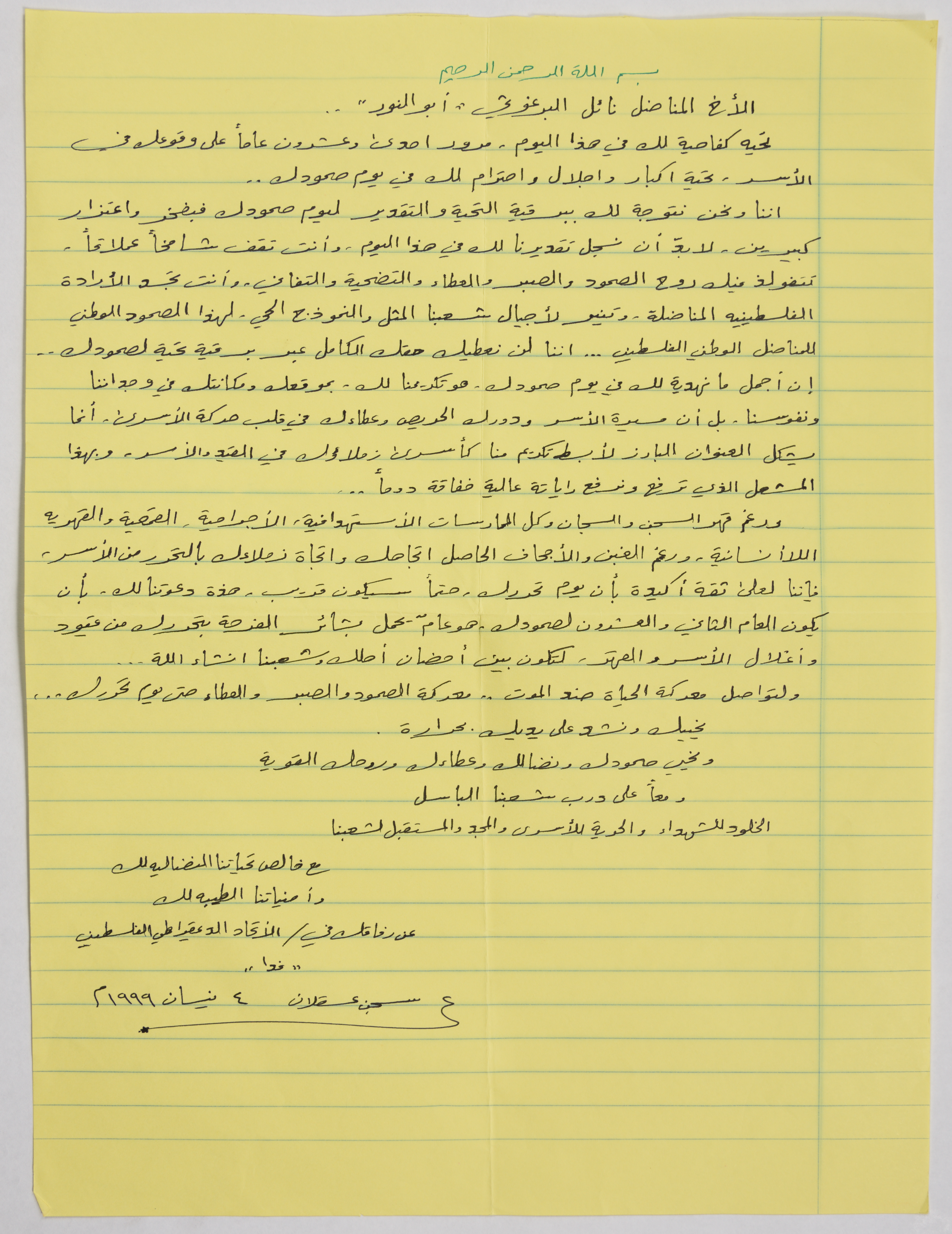 مادة مكتوبة بخط اليد من صفحة واحدة، أرسلها الاتحاد الديموقراطي الفلسطيني "فدا" من سجن عسقلان، إلى الأسير نائل البرغوثي في السجن، تحيي في الرسالة في ذكرى أسره الواحد والعشرين صموده، ومقاومته الاحتلال في أسره.