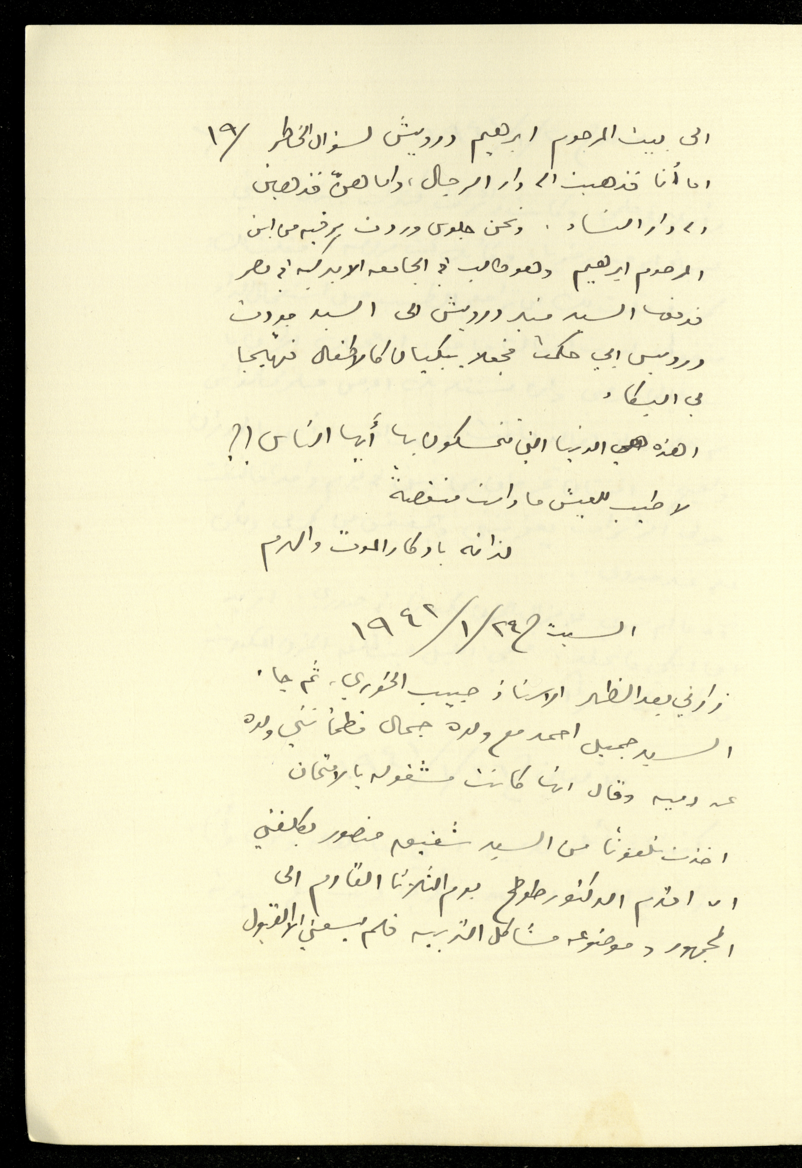 توثق هذه المادة الأرشيفية، المكتوبة بخط يد خليل السكاكيني؛ تكملة يوميته المؤرخة في الجمعة الموافق 23 كانون الثاني 1942؛ حيث ذهب الى بيت إبراهيم درويش، وأنهى يوميته بسؤال "أهذه الدنيا التي تتمسكون بها أيها الناس؟!" وبيت الشعر القائل: "لا طيب للعيش ما دامت منغصة لذاته بإدكار الموت والهرم". وفي نفس الصفحة سجل يوميته المؤرخة في يوم السبت الموافق 24 كانون الثاني 1942، فقد زاره بعد الظهر الأستاذ حبيب خوري ثم جاء السيد جميل أحمد مع ابنه الذي بدوره طمأن خليل على ابنته دمية وقال انها كانت مشغولة بالامتحانات، ومن ثم تحدث مع السيد شفيق منصور الذي كلفه أن يقدم الدكتور طوطح يوم الثلاثاء الى الجمهور للحديث حول مشاكل التربية.