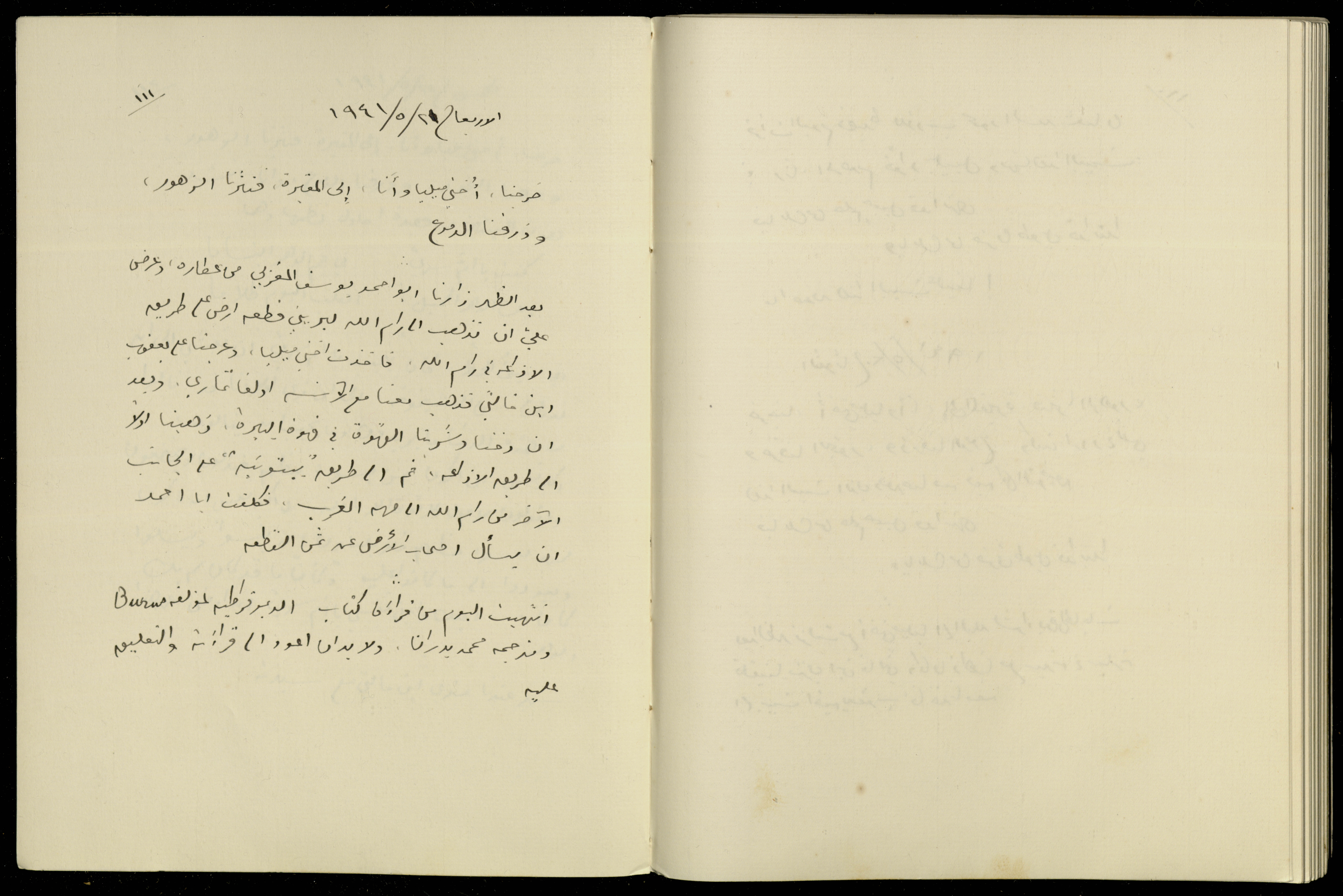 Handwritten, this archival item documents the continuation of the diaries of Khalil Sakakini on Wednesday, 21 May 1941, which he began by mentioning visiting the cemetery and scattering flowers with his sister Milia, the visit of Abu Ahmad Yousef al-Maghrebi from Atara in the afternoon suggesting to accompany him to see a piece of land at al-Itha'a street with his sister Milia, his cousin Yacoub and Olga Tamari, then going to Betounia assigning Abu Ahmad to ask the owners of the land about its price, he also mentioned that he finished reading the book titled "Democracy" by Burns and translated by Mohammad Badran.