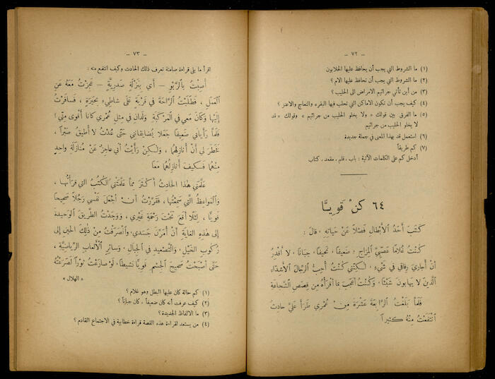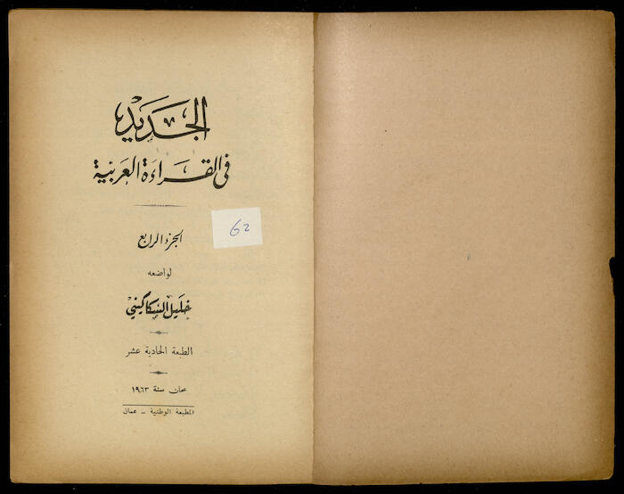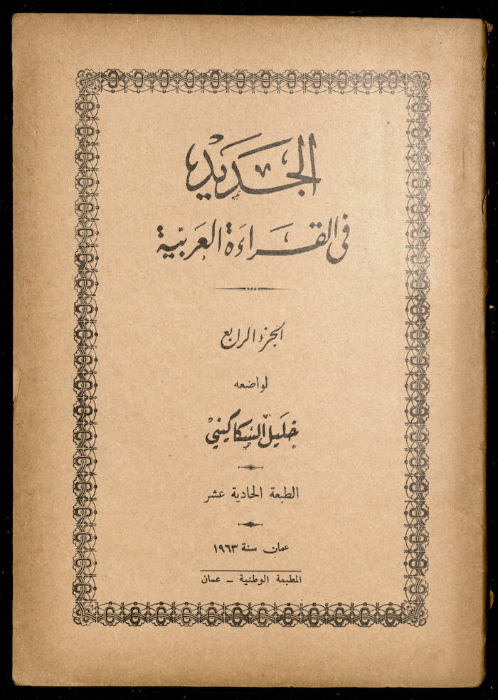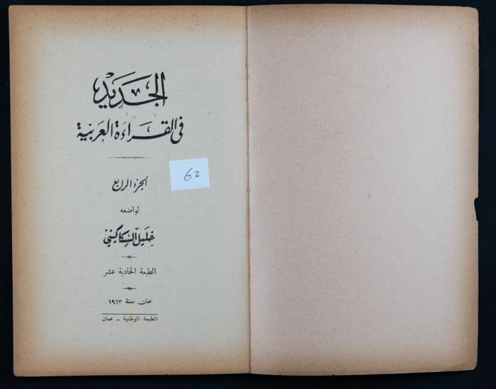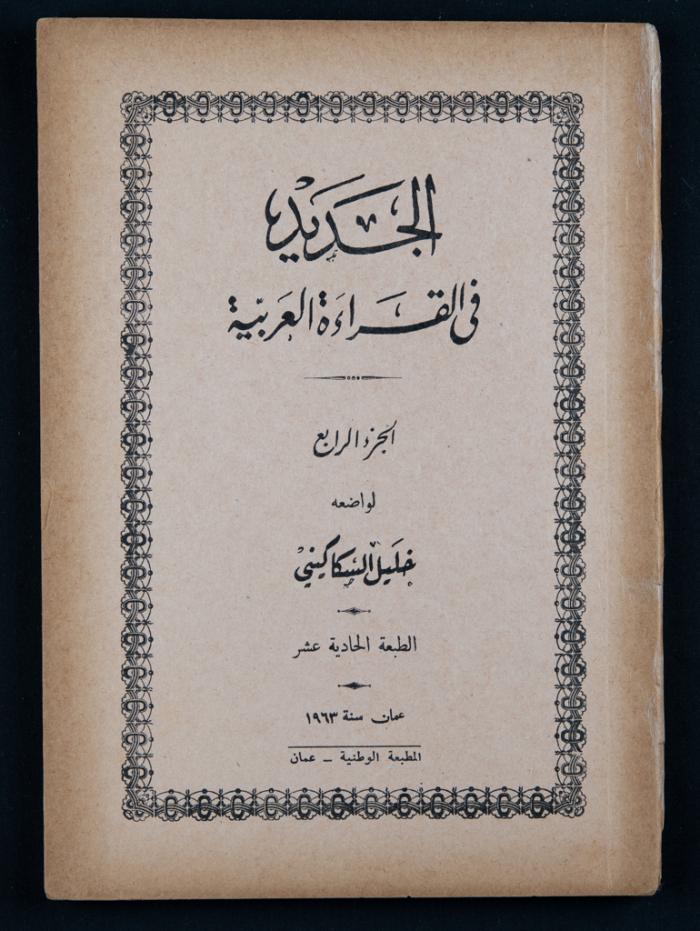 Issued by the National Press in Amman in 1963, this is the 11th issue of the fourth part of the book "Al-Jadeed Fil-Qeraa al-Arabeyyah" (the New in Arabic Reading) by Khalil Sakakini.