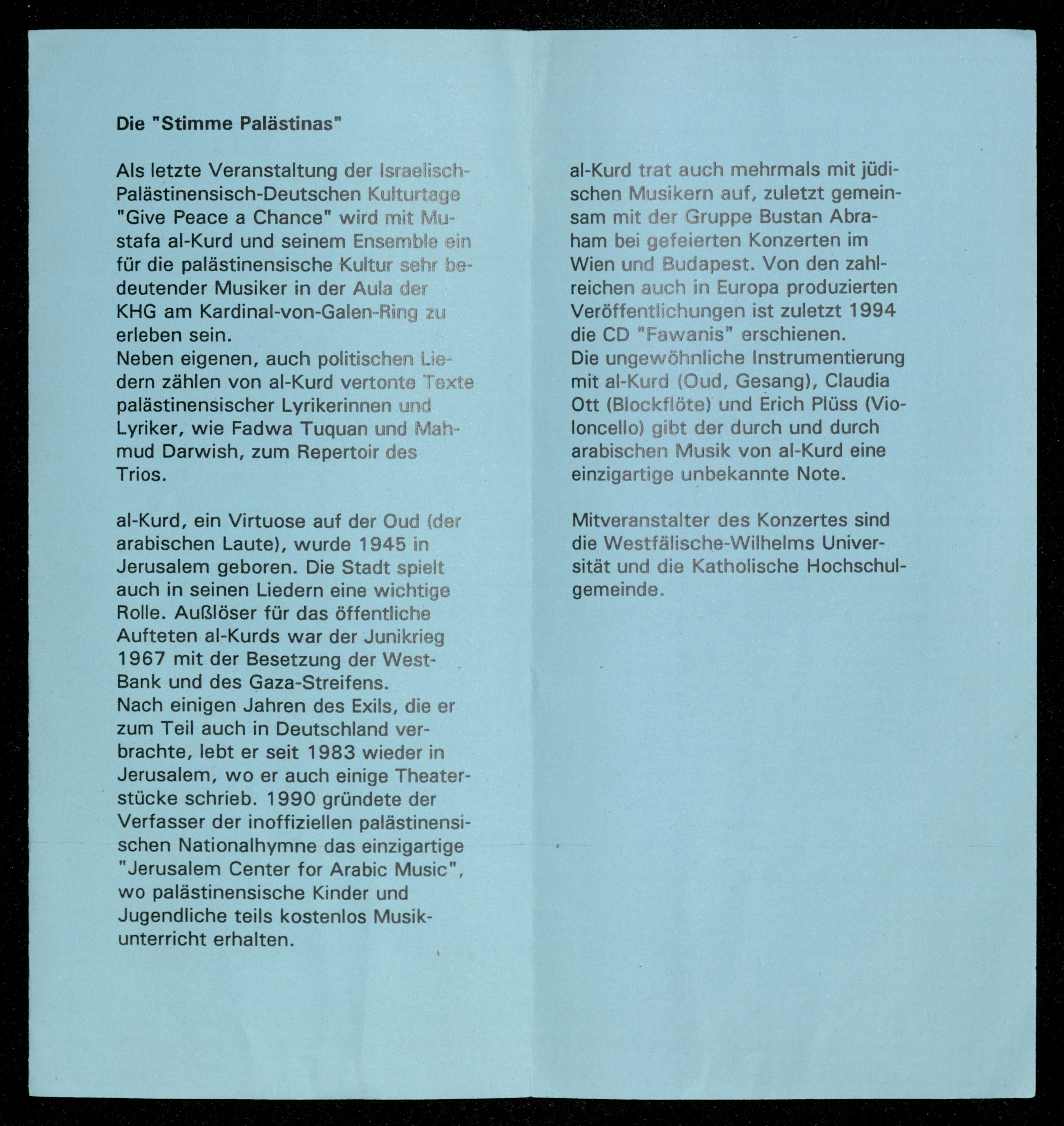 نشرة غير مؤرخة مطبوعة باللغة الألمانية وتتضمن صورة لمصطفى الكرد وتروج لعرض موسيقي أقيم في ألمانيا تحت عنوان "أيام الثقافة الإسرائيلية-الفلسطينية-الألمانية" (أعطوا السلام فرصة)، وتشير إلى إقامة الحفل الساعة الثامنة من مساء يوم الجمعة بتاريخ 10 أيار، كما تراوحت رسوم تذاكر الدخول بين 7 مارك ألماني و10 مارك ألماني.