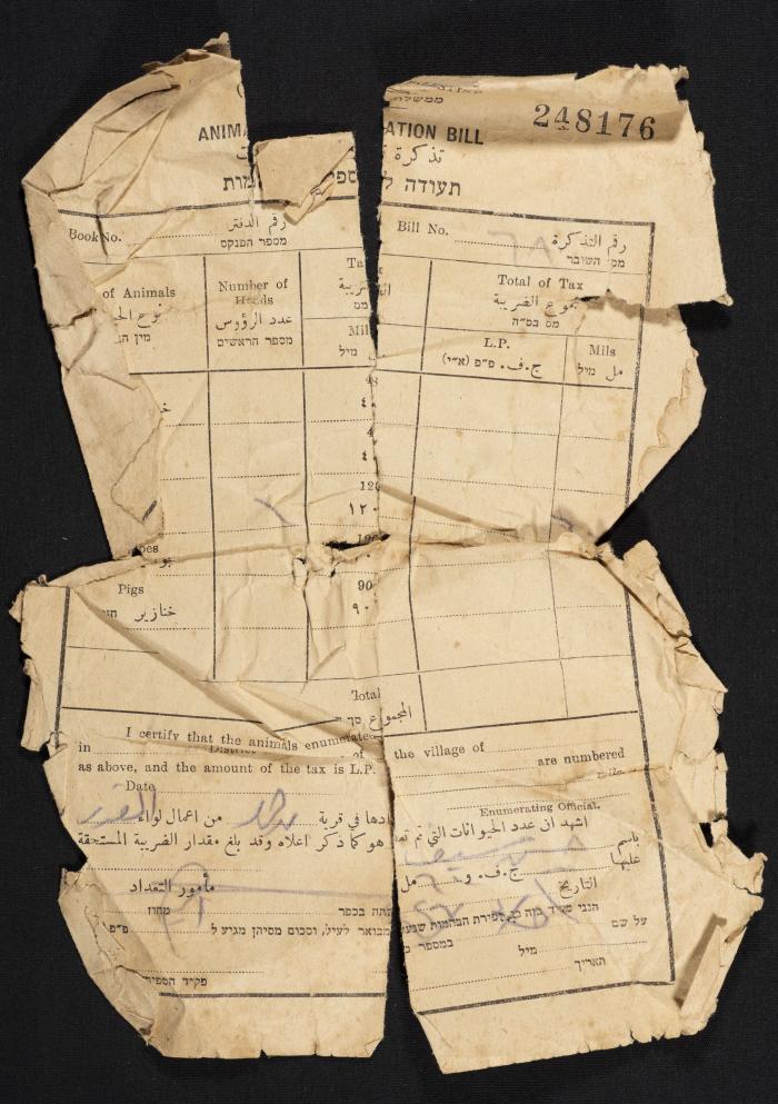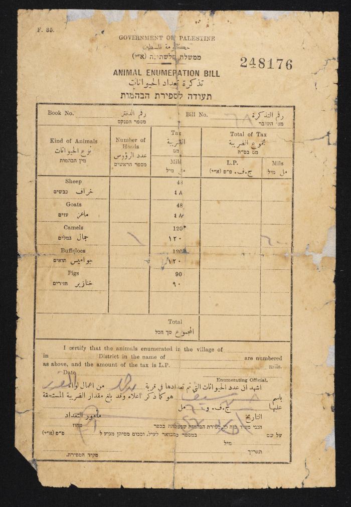 "Animal Enumeration Bill" for Hasan Misyef by the Government of Palestine, 1946