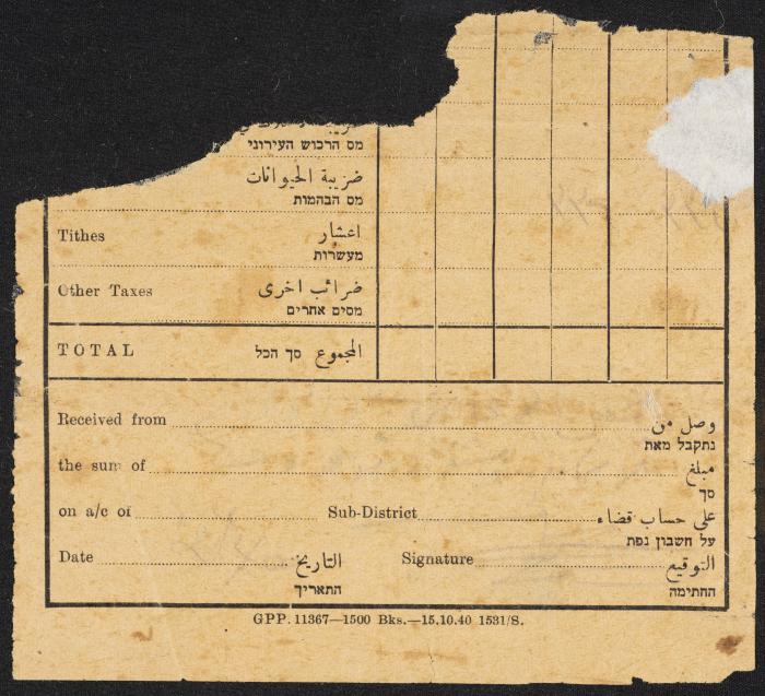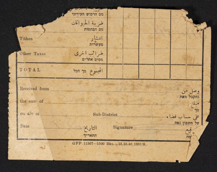 "Tax Receipt" for Khalil Abuayyash by the Government of Palestine, 25 February 1922