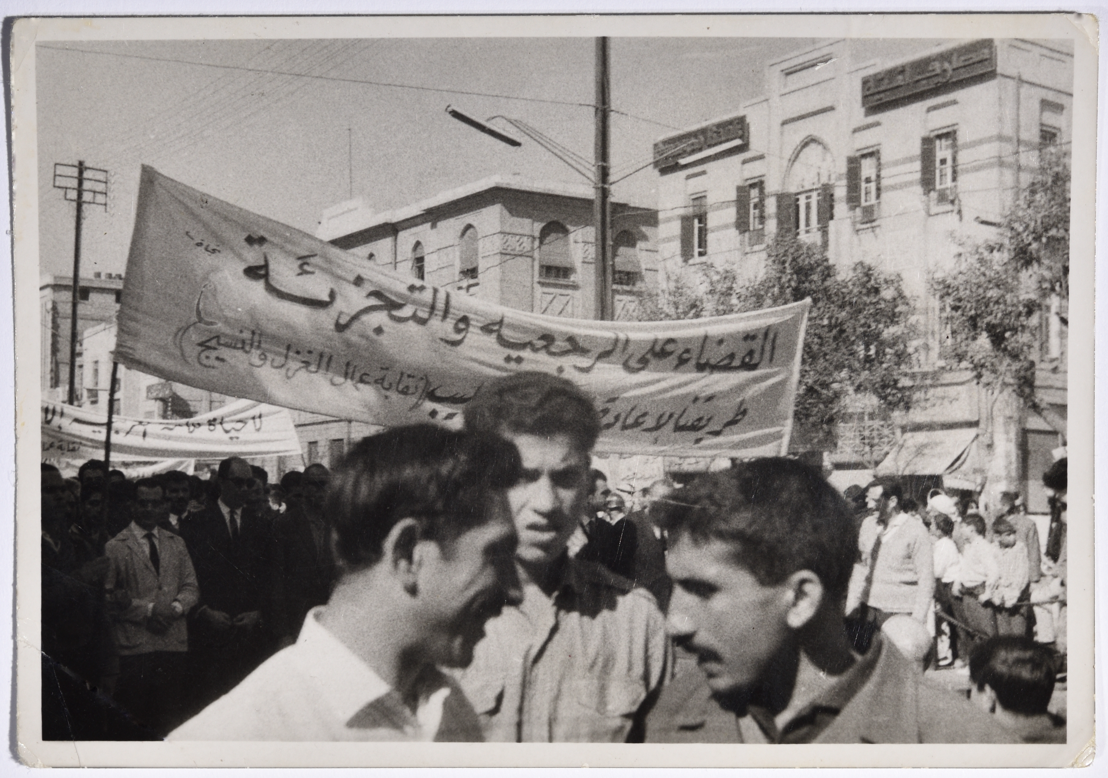 Taken in the late 1950s in Damascus, this black-and-white photograph features a protest against Baghdad Pact. Posters of the General Syndicate for Spinning & Weaving condemning division and calling for unity are also seen in the photograph.