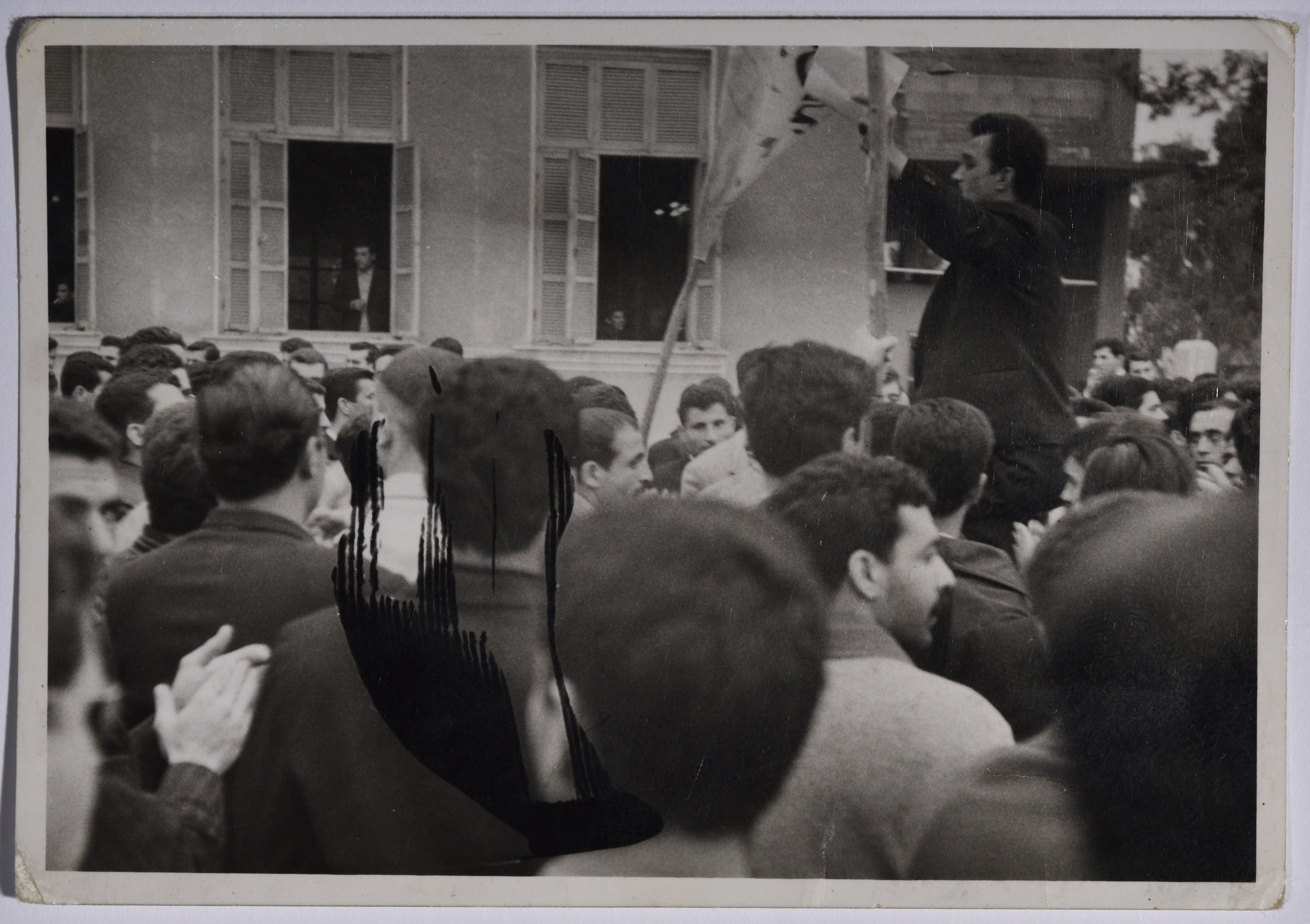 Taken in the late 1950s in Damascus, this black-and-white photograph features a protest at the Ministry of Interior against Baghdad Pact. Protesters are seen surrounding a protester held over other protesters' shoulders.