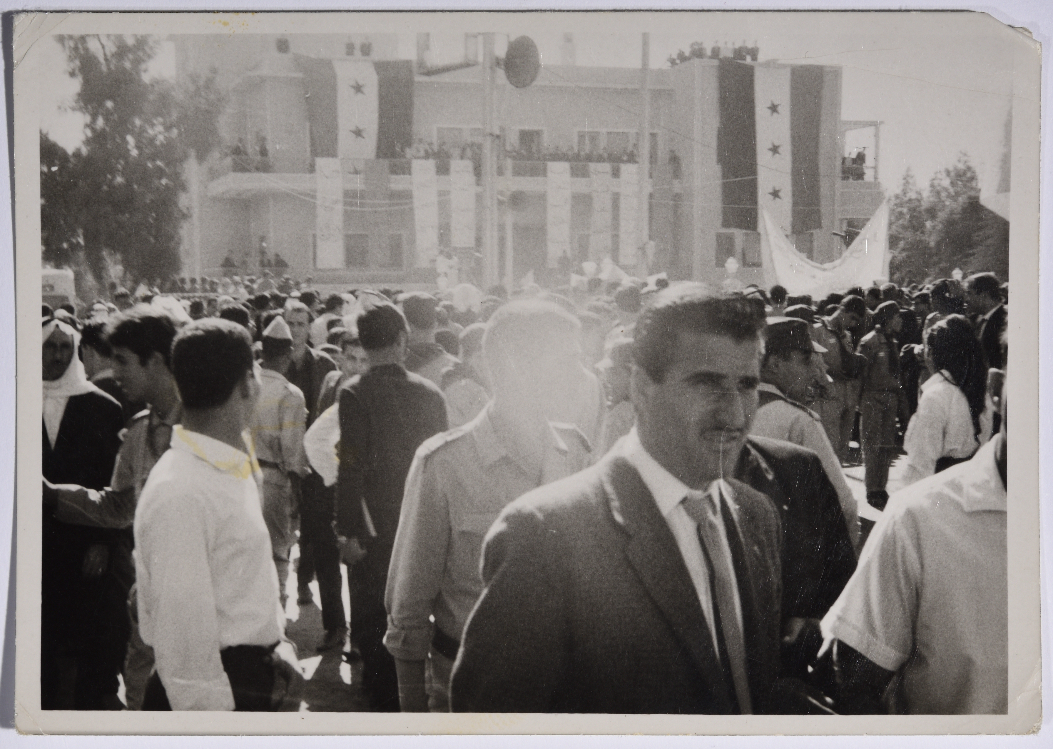 Taken in the late 1950s, this black-and-white photograph features a protest in front of a government premises in Damascus against Baghdad Pact. Two large Syrian flags are seen on the premises.