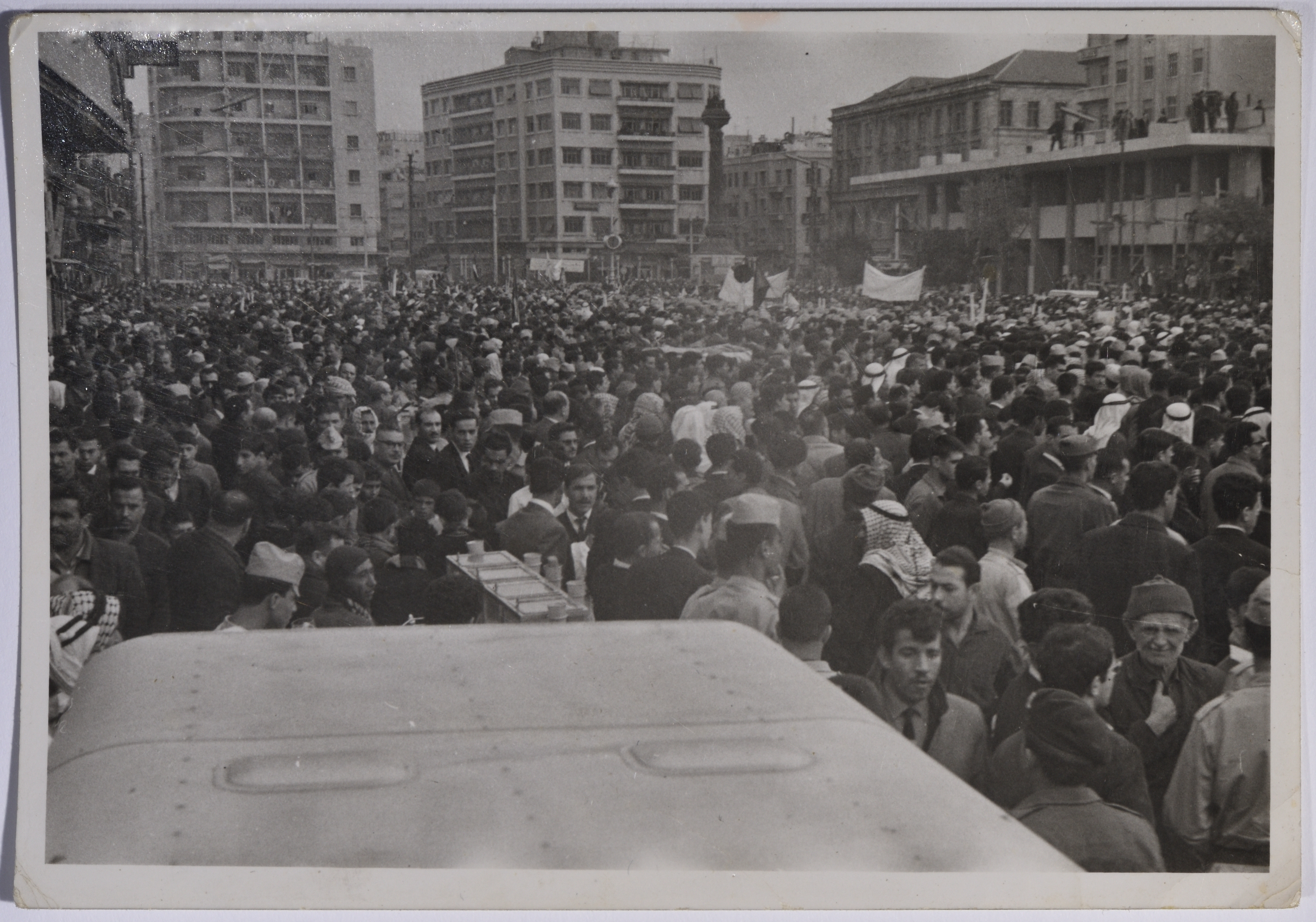 Taken in the late 1950s, this black-and-white photograph features a protest in Damascus against Baghdad Pact.