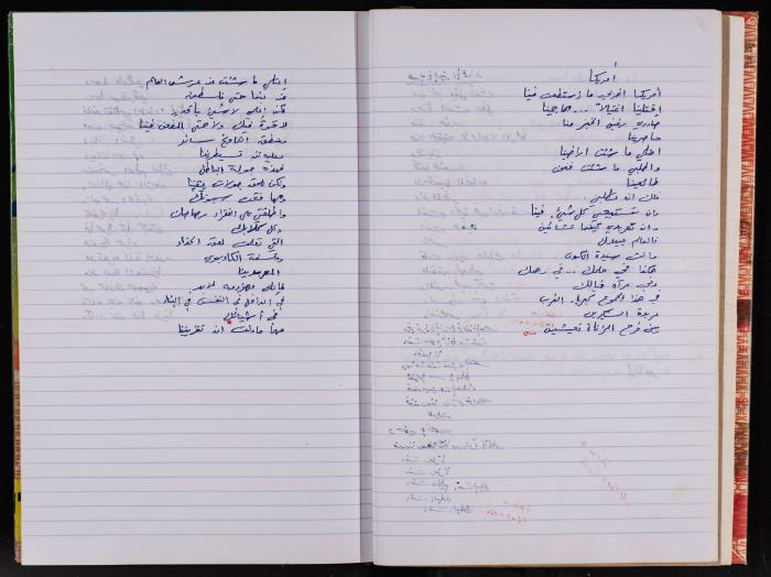 قصيدة مكتوبة بخط اليد بعنوان "أمريكا" دونت بتاريخ 20 أيلول 2001 للأسير محمد ناصر في سجن عسقلان الذي اعتقل بتاريخ 10 تموز 1985 وحكم عليه بالسجن المؤبد بتهمة انتماءه الى حركة فتح.