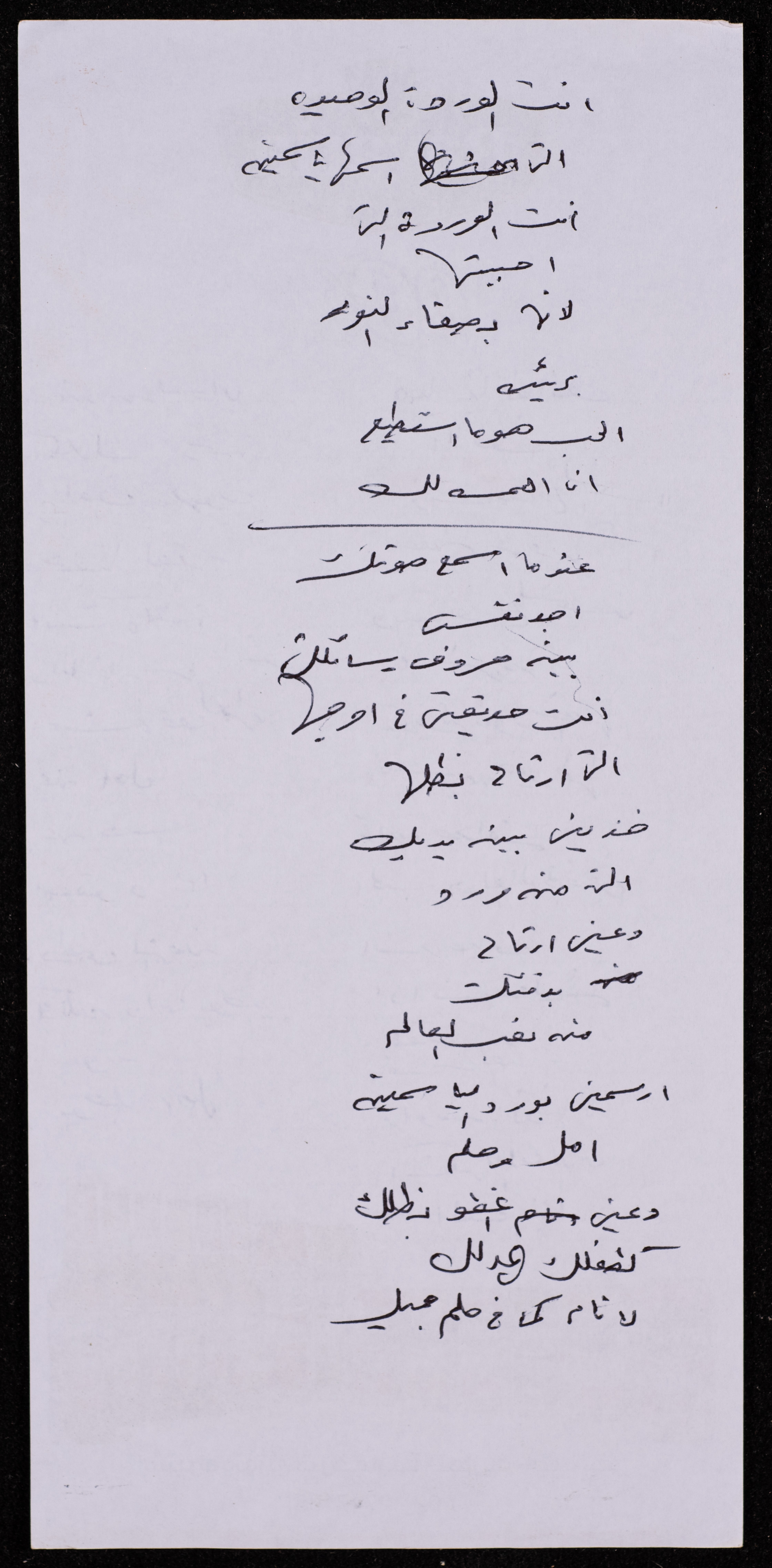 قصيدة غير معنونة مكتوبة بخط اليد للأسير محمد إبراهيم ناصر في سجون الاحتلال الذي اعتقل بتاريخ 10 تموز 1985 وحكم عليه بالسجن المؤبد بتهمة انتماءه لحركة فتح. كتبت القصيدة على ورقة مروسة بشعار شركة بافاريا.
