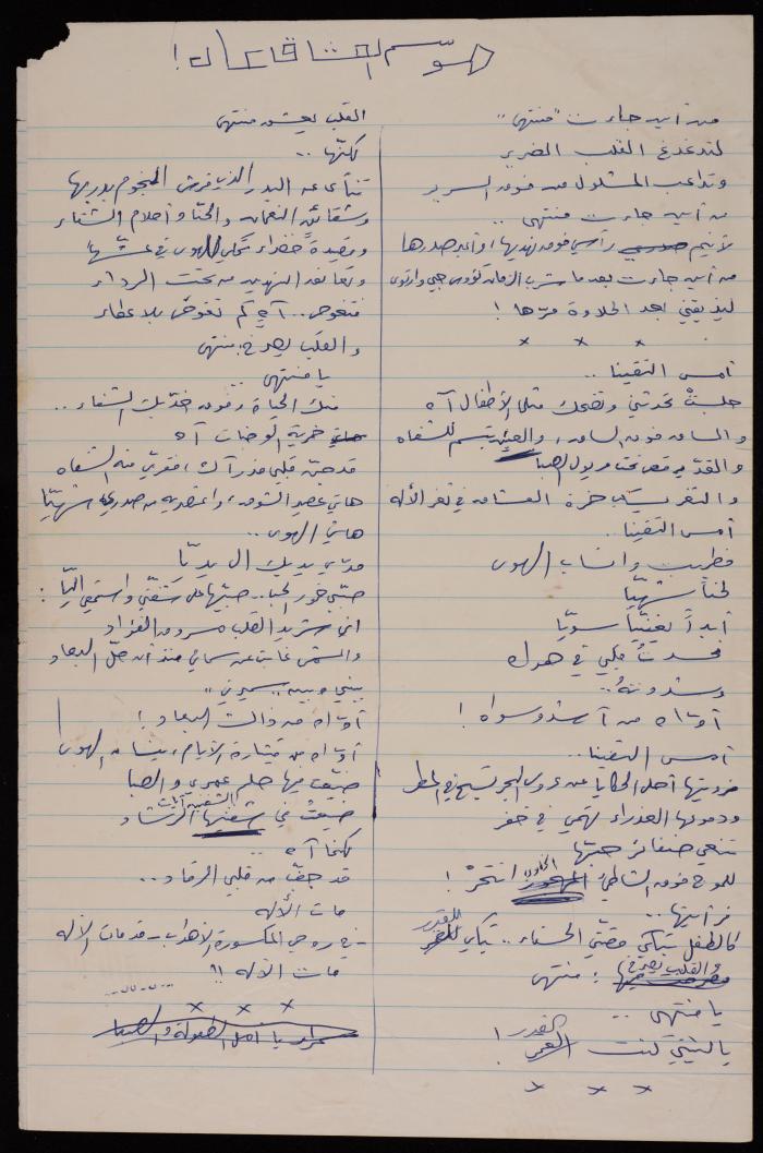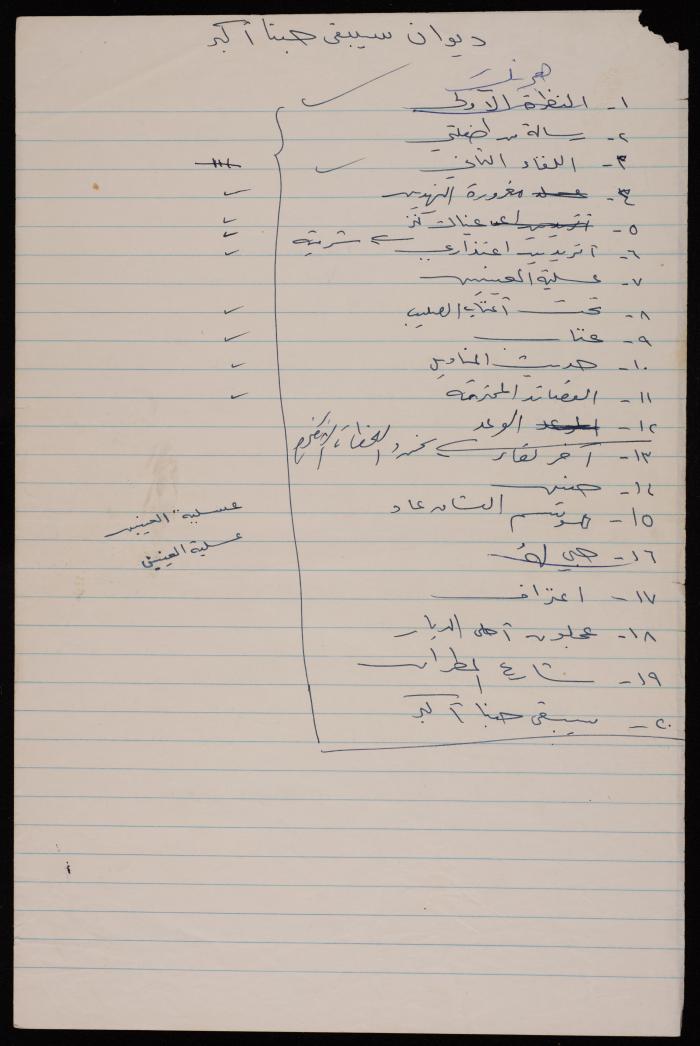 Handwritten in Arabic, this document shows verses from Ali Fodeh's poem titled "Mawsem al-Ushaq Qad Aad (Lovers Season Is Back)", and poem titles from the poetry collection titled "Sa-Yabqa Hubuna Akbar (Our Love Will Remain Greater)" including "an-Nathra al-Ula (The First Sight)", "Risala Min Tiflati (A Letter from My Child)", "al-Liqa' ath-Thani (The Second Meeting)", "Aynaki Kanz (Your Eyes Are a Treasure)", "a-Tureeden I'tithari (Do You Want My Apology)", "Hadeeth al-Manadil (Handkerchiefs Talk)", "al-Waad (The Promise)", "al-Mawsem ath-Thani Aad (The Second Season Is Back)", "I'tiraf Share' al-Mutran (ِal-Mutran Street Confession)" and "Yabqa Hubbuna Akbar (Our Love Is Greater)". ;Ozrail, Samar. Hind Battah. "Ali Fodeh Collection". Archival Inventory, 17 December 2019. The Palestinian Museum Digital Archive.
