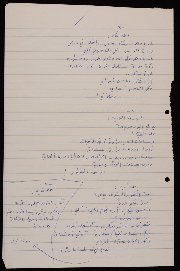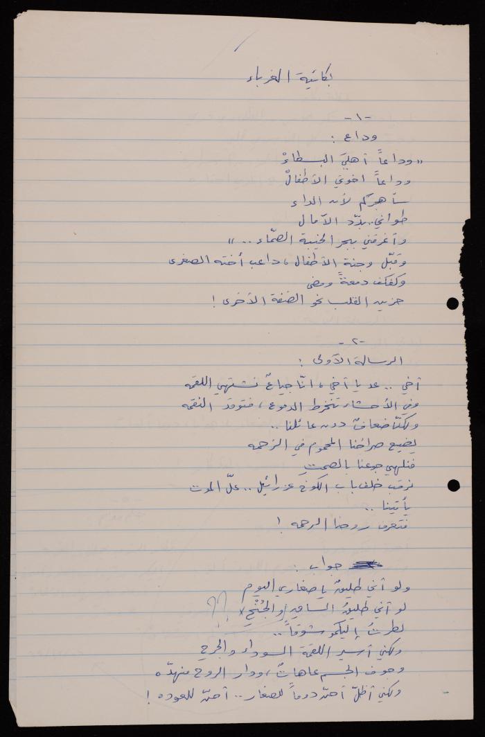 Handwritten in Arabic on 26 December 1969, this document shows a two-page draft of Ali Fodeh's poem titled "Buka'iyet al-Ghuraba' (Strangers Lamentation)". ;Ozrail, Samar. Hind Battah. "Ali Fodeh Collection". Archival Inventory, 17 December 2019. The Palestinian Museum Digital Archive.