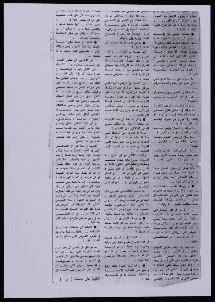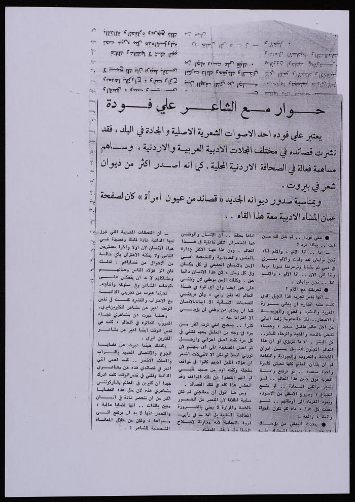 Printed in Arabic, this document shows a clipping from ad-Dustour Newspaper that features a published interview between Amman al-Masa' and Ali Fodeh on the occasion of the launch of his new poetry collection titled "Qasa'id min Oyoun Imra'a (Poems from the Eyes of a Woman)". ;Ozrail, Samar. Hind Battah. "Ali Fodeh Collection". Archival Inventory, 17 December 2019. The Palestinian Museum Digital Archive.