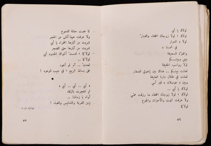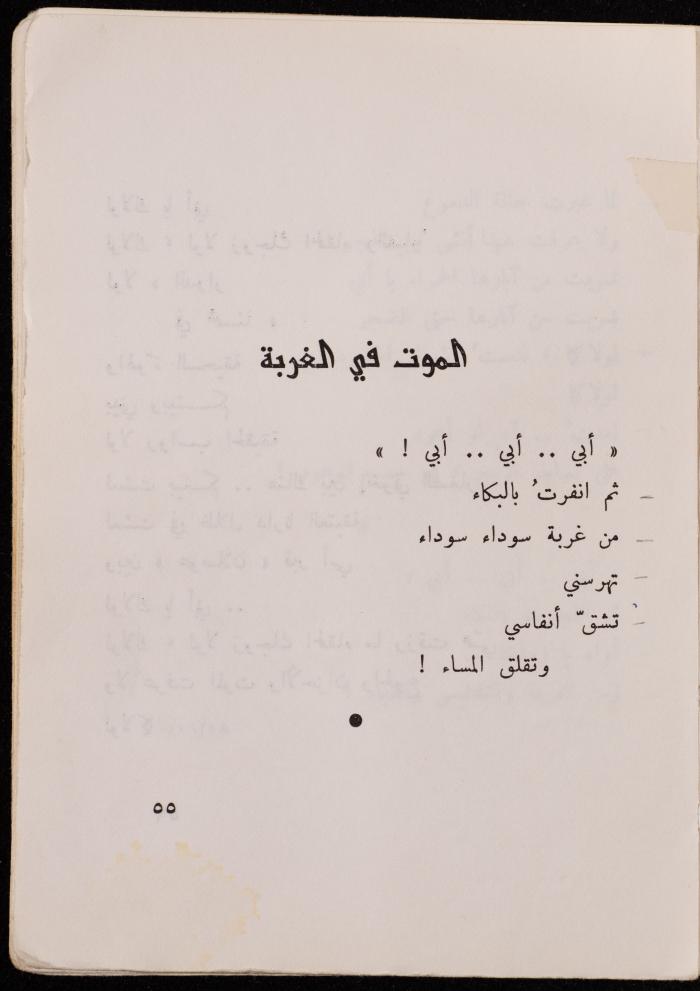 Printed in Arabic, this document shows a poem by Ali Fodeh titled "Al-Mawt Fil-Ghurba (Death in Exile)", and it is from his poetry collection "Qasa'id min Oyoun Imra'a (Poems from the Eyes of a Woman)" which was published in 1973. ;Ozrail, Samar. Hind Battah. "Ali Fodeh Collection". Archival Inventory, 17 December 2019. The Palestinian Museum Digital Archive.