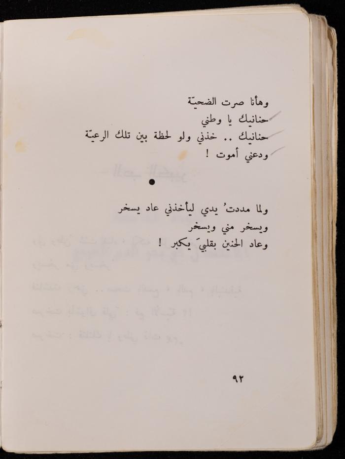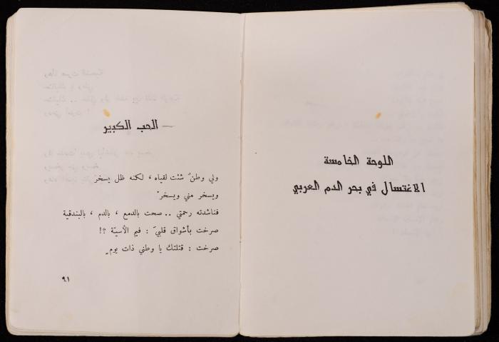 Printed in Arabic, this document shows poems by Ali Fodeh titled "Al-Hob al-Kabeer (The Big Love)", and the fifth collection titled "Al-Ightisal Fi Bahr ad-Dam al-Arabi (Bathing in the Sea of Arab Blood)" which is from his poetry collection "Qasa'id min Oyoun Imra'a (Poems from the Eyes of a Woman)" which was published in 1973. ;Ozrail, Samar. Hind Battah. "Ali Fodeh Collection". Archival Inventory, 17 December 2019. The Palestinian Museum Digital Archive.