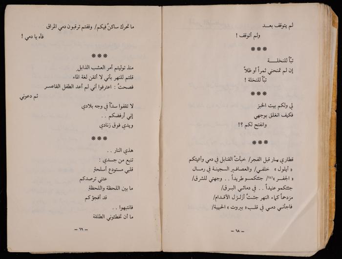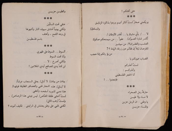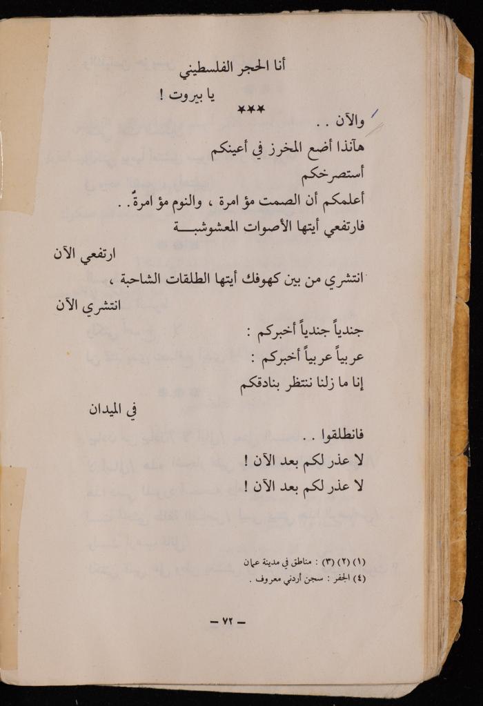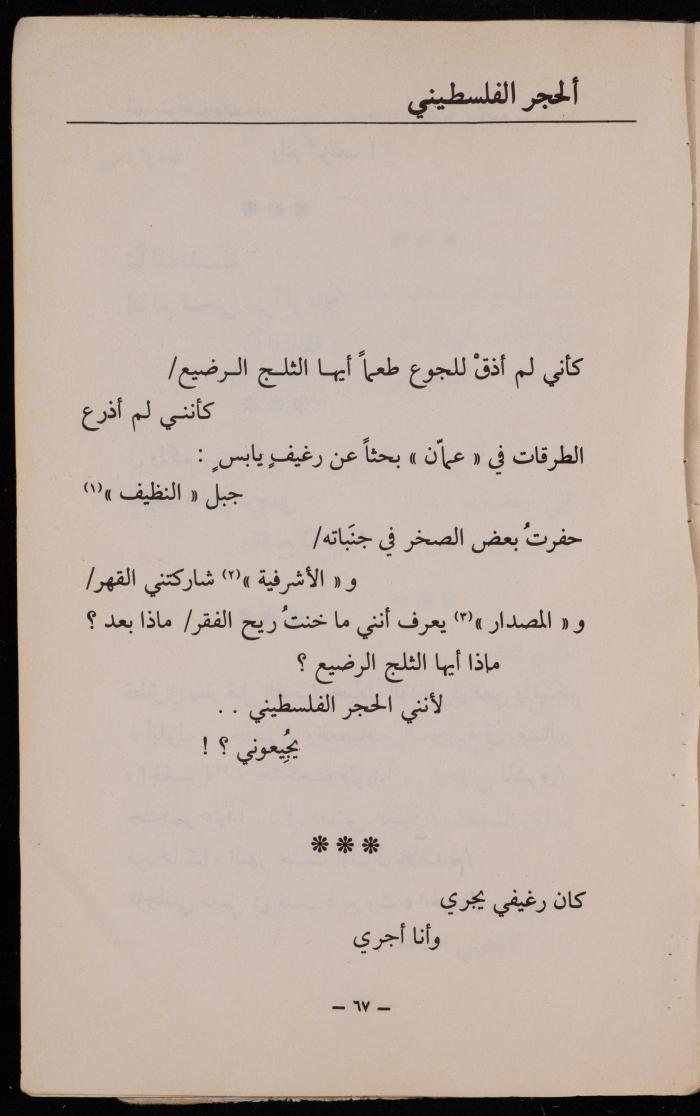 Printed in Arabic, this document shows a poem by Ali Fodeh titled "Al-Hajar al-Falastini (The Palestinian Stone)", and it is from his poetry collection "Iwa' ath-Thi'b (Howl of the Wolf)" which was published in 1977.;Ozrail, Samar. Hind Battah. "Ali Fodeh Collection". Archival Inventory, 17 December 2019. The Palestinian Museum Digital Archive.