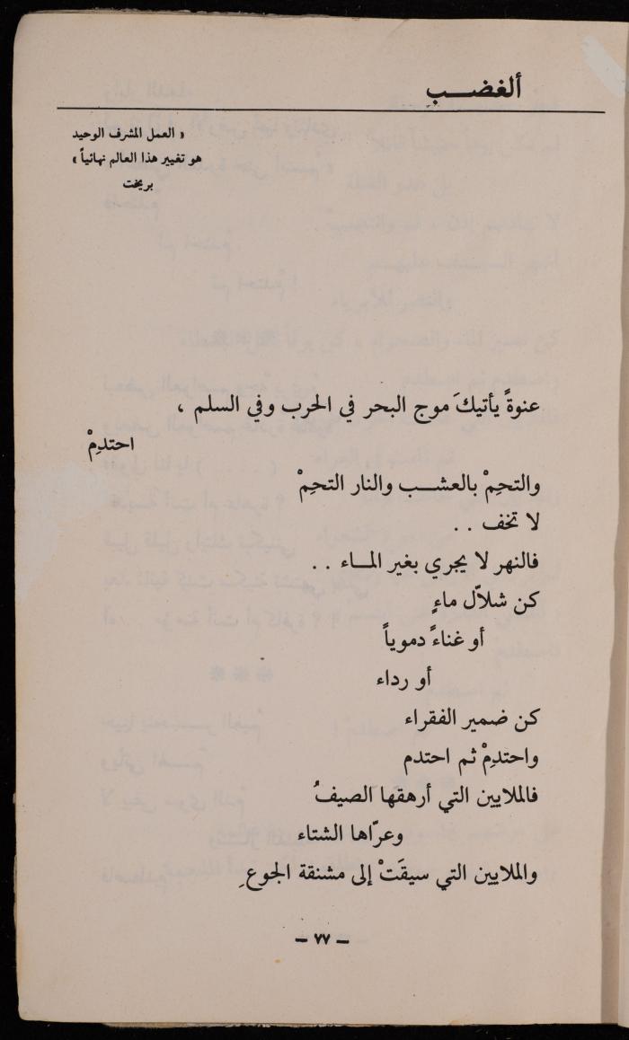 Printed in Arabic, this document shows a poem by Ali Fodeh titled "Al-Ghadab (Anger)", and it is from his poetry collection "Iwa' ath-Thi'b (Howl of the Wolf)" which was published in 1977.;Ozrail, Samar. Hind Battah. "Ali Fodeh Collection". Archival Inventory, 17 December 2019. The Palestinian Museum Digital Archive.