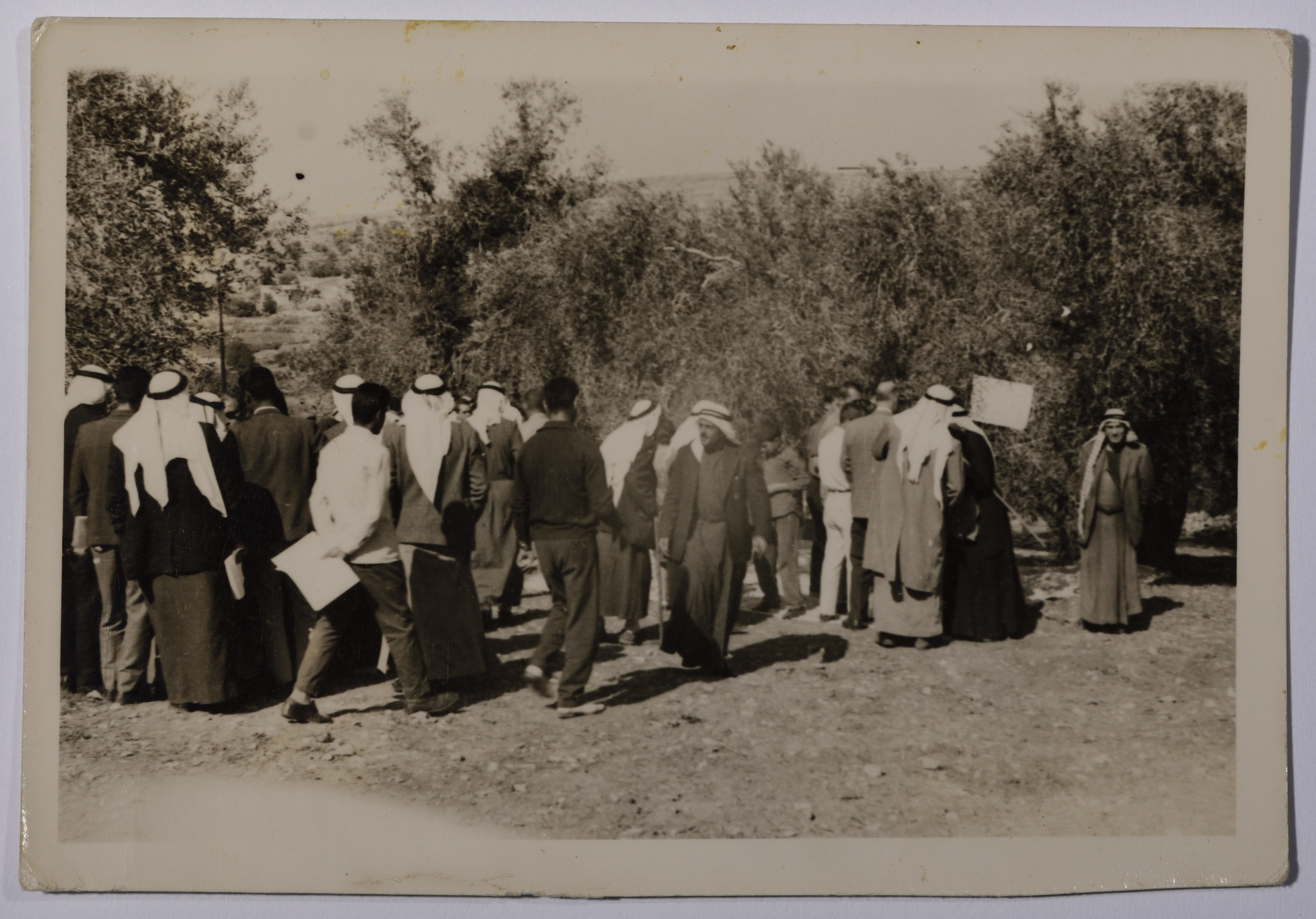 صورة بالأبيض والأسود لمجموعة من رجالات بلدة سلفيت وقد تجمهروا في منطقة برية في سلفيت، يظهر الرجال وهم يرتدون الزي التقليدي للبلدة، الذي هو عبارة عن حطة وعقال وقمباز ودماية، التقطت الصورة في خمسينيات القرن الماضي.