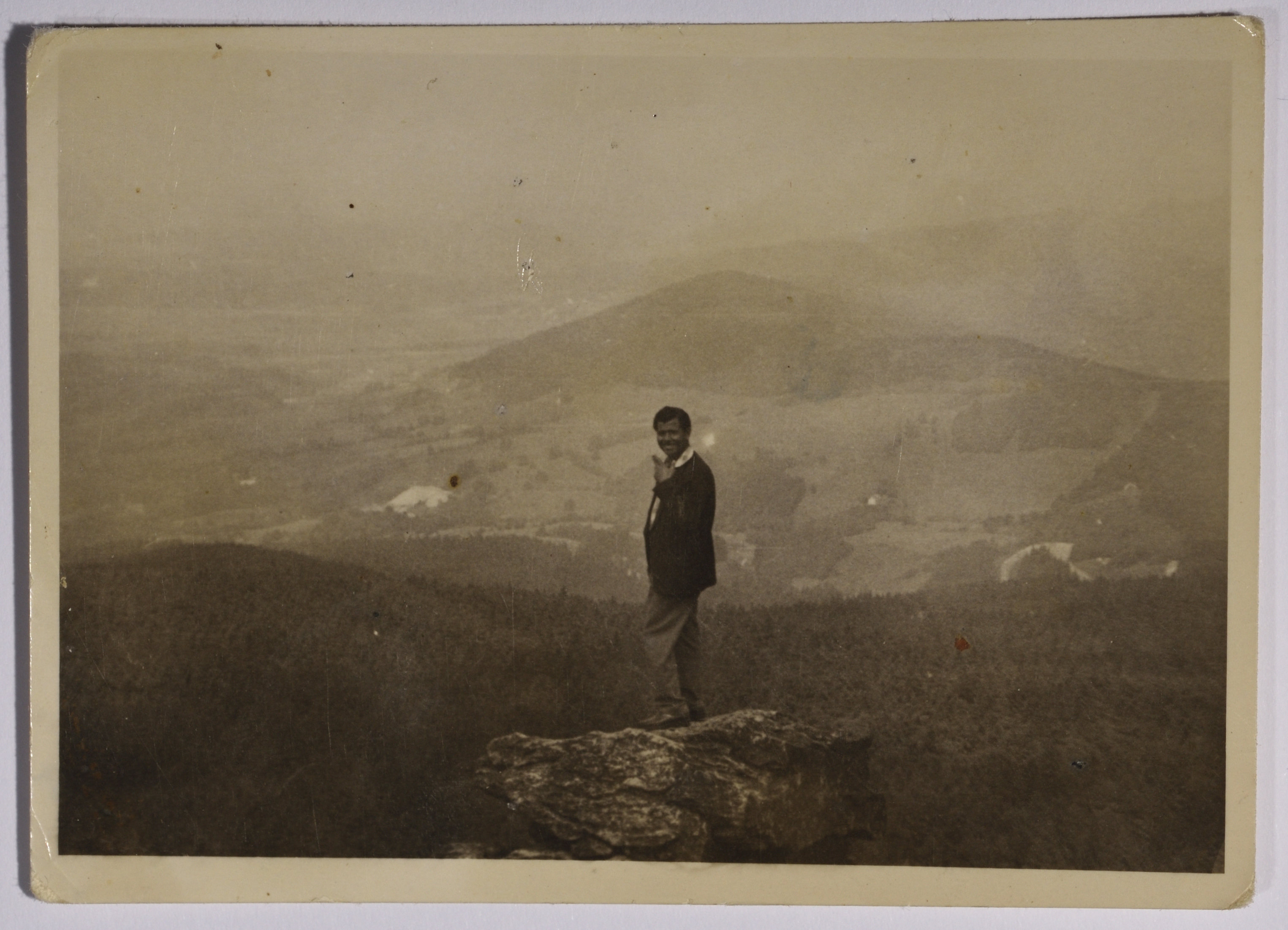 صورة بالأبيض والأسود لراجح السلفيتي وهو يقف على صخرة ومن حوله منطقة برية تسمى"قطان الحويط" في سلفيت، التقطت الصورة في أواخر أربيعنيات القرن الماضي.