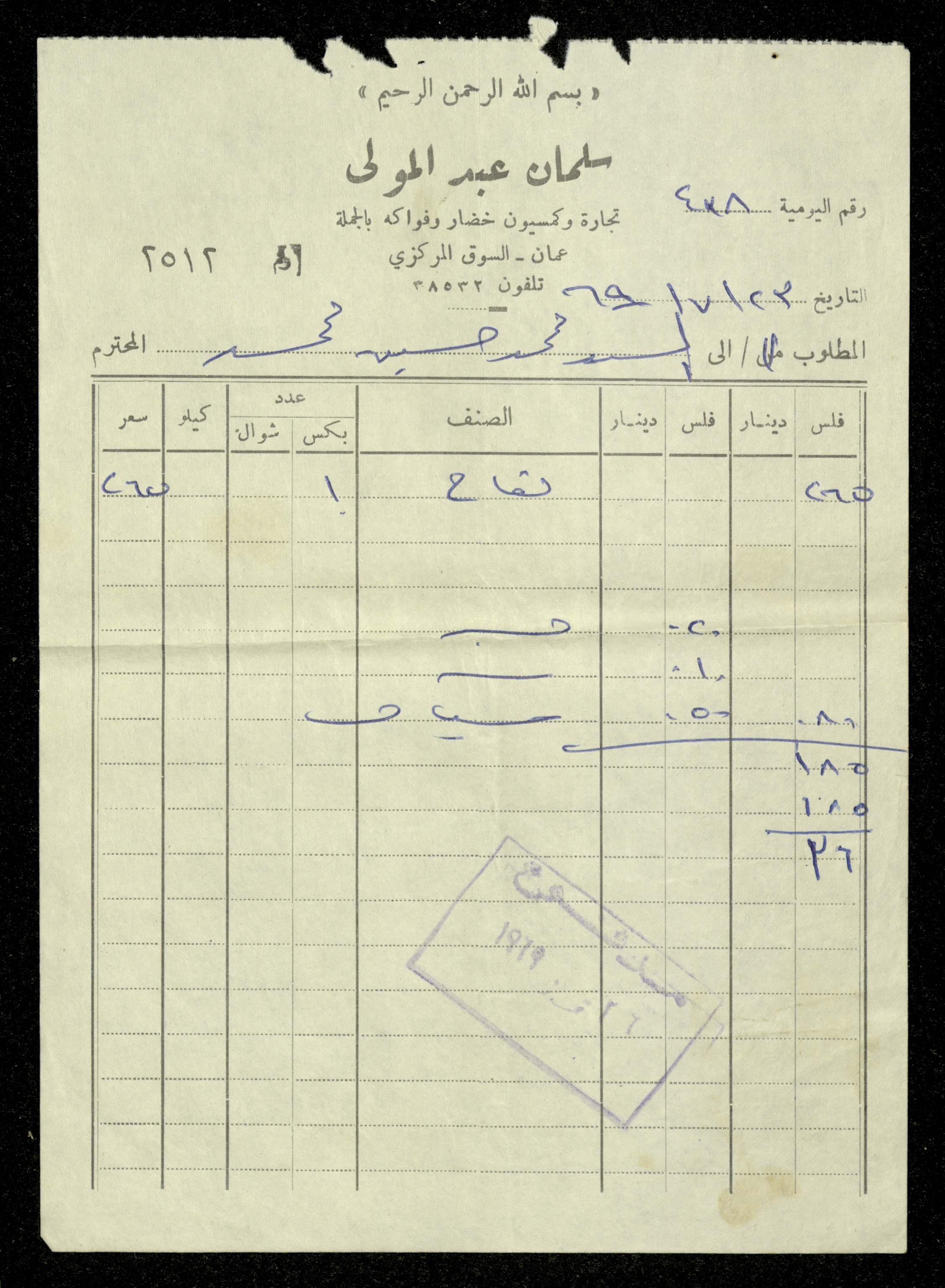 Printed in Arabic, this document features an invoice issued on 23 July 1969, by Salman Abdel Mawla stores for vegetables and fruits in Amman, for Mohammad Husein Ibregeith, including prices and crops he was selling to the store.