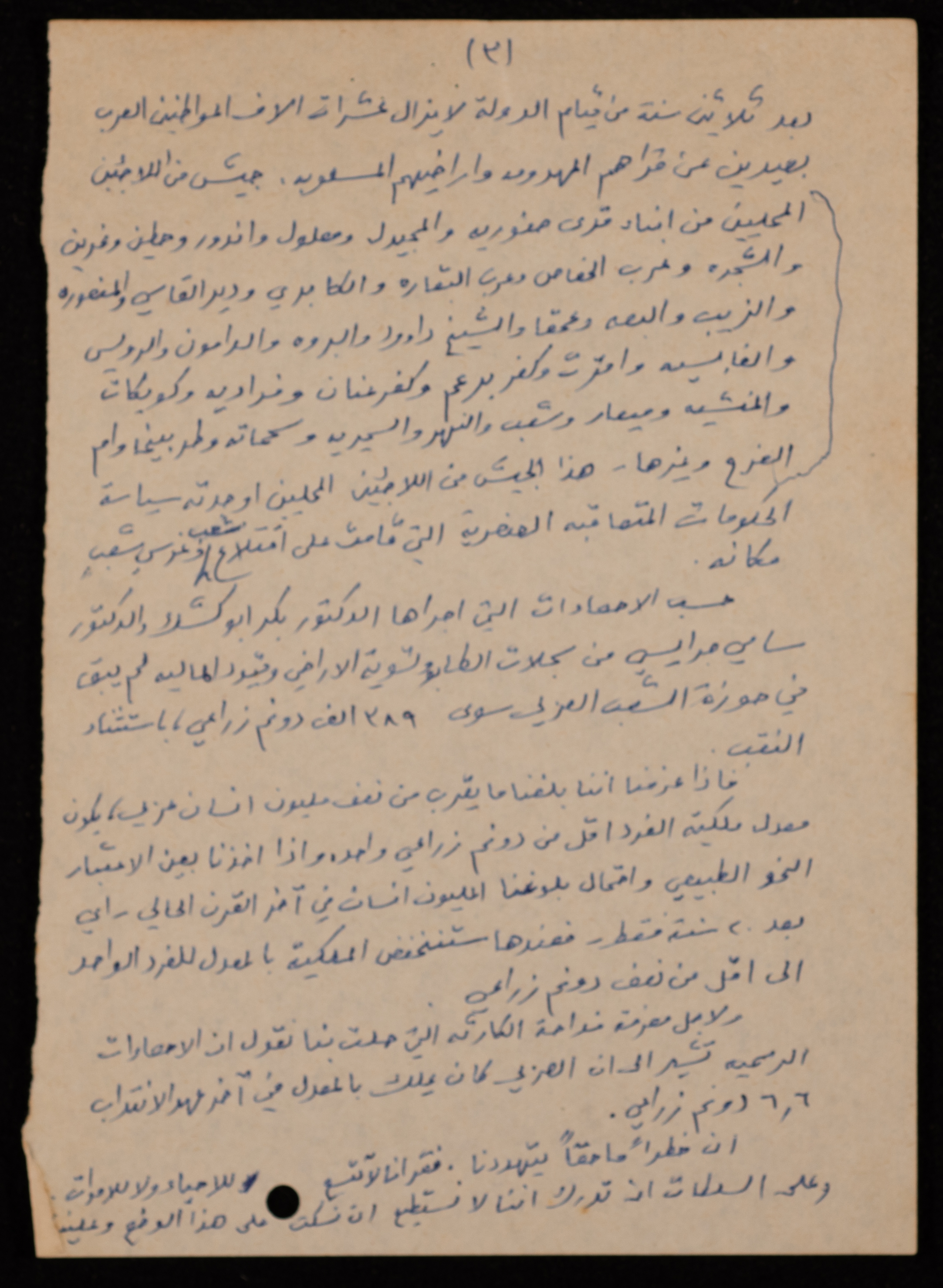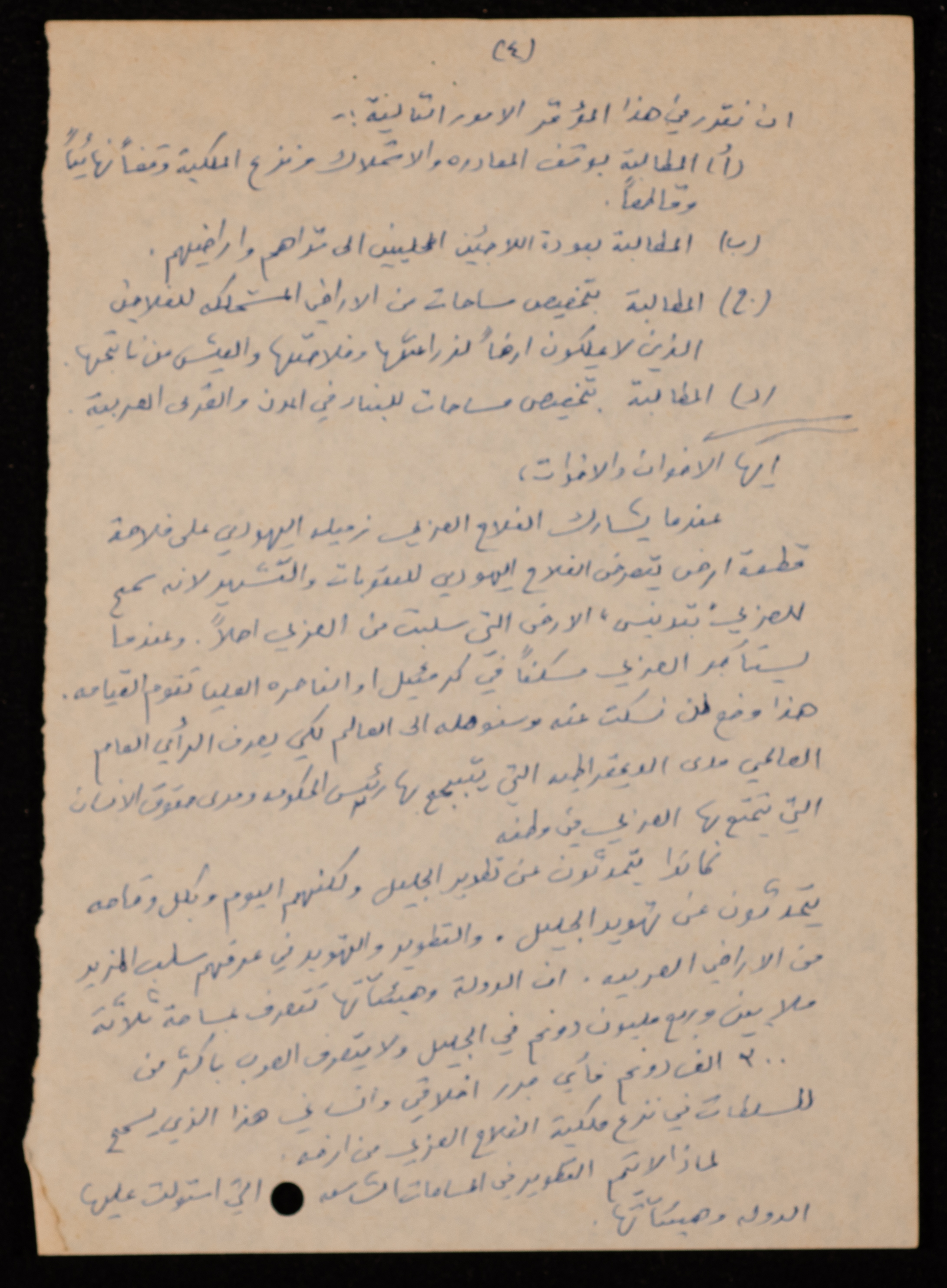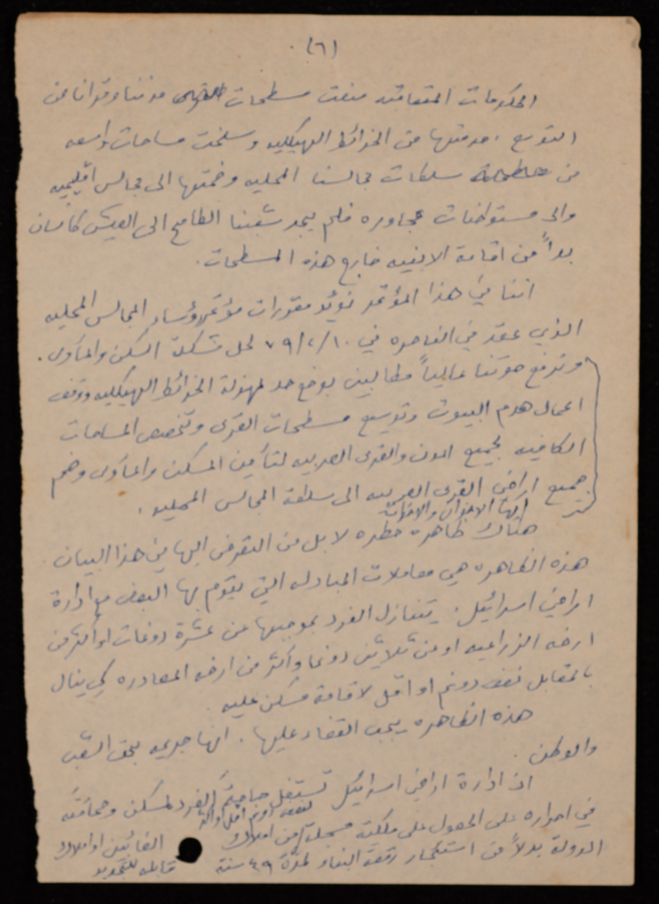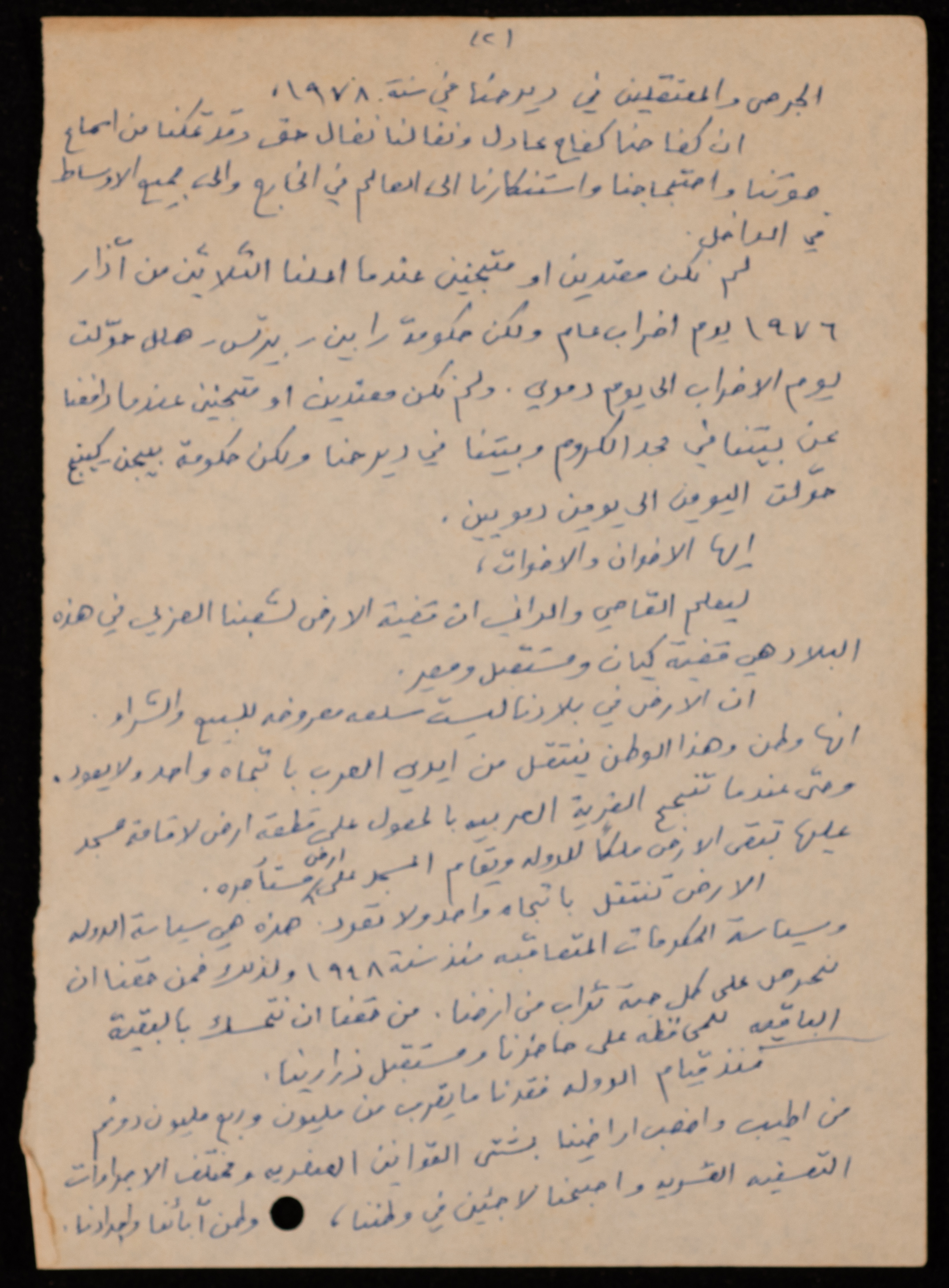 توثق هذه المادة الأرشيفية باللغة العربية والمكتوبة بخط اليد، بيان عام للمؤتمر الشعبي المنعقد في القاهرة بتاريخ 17 شباط 1979، صادر عن اللجنة القطرية للدفاع عن الأراضي.