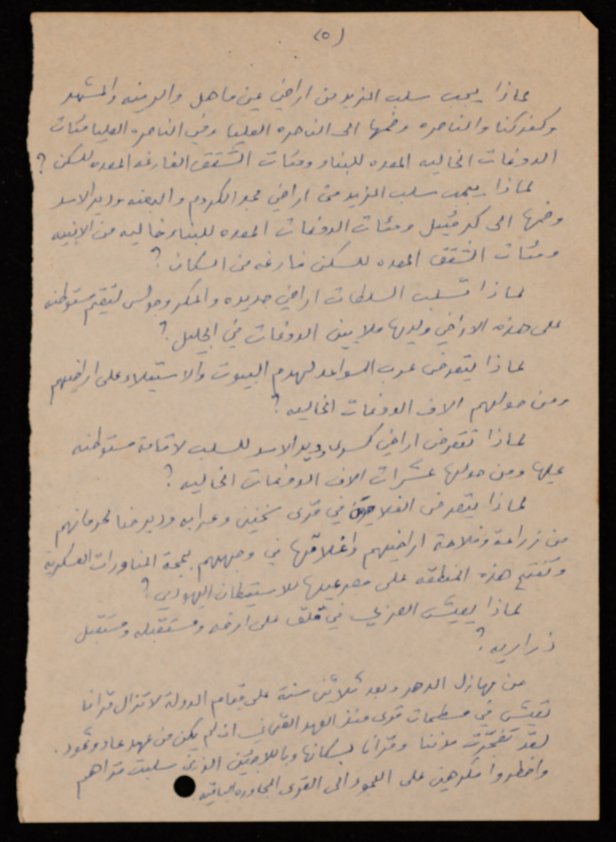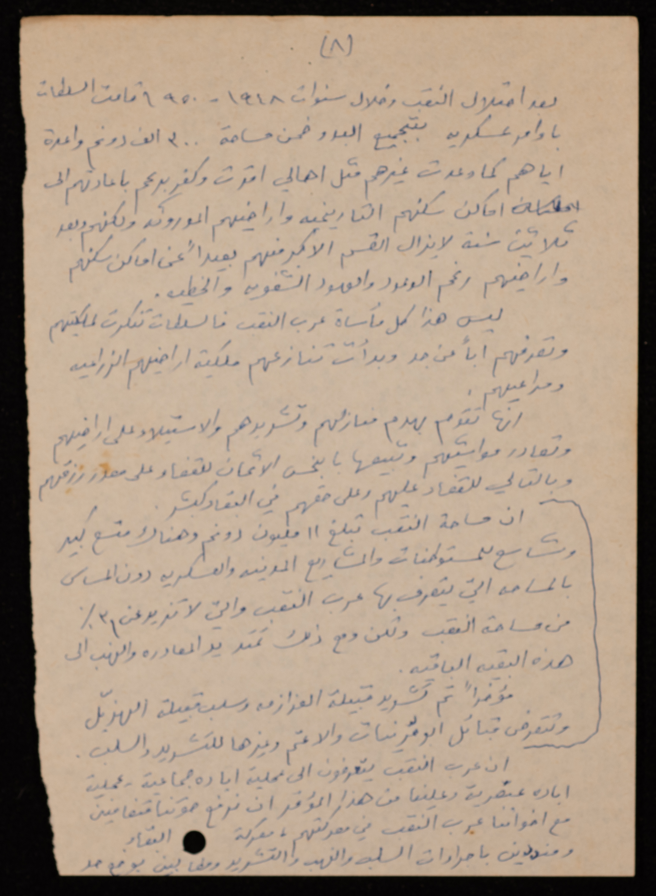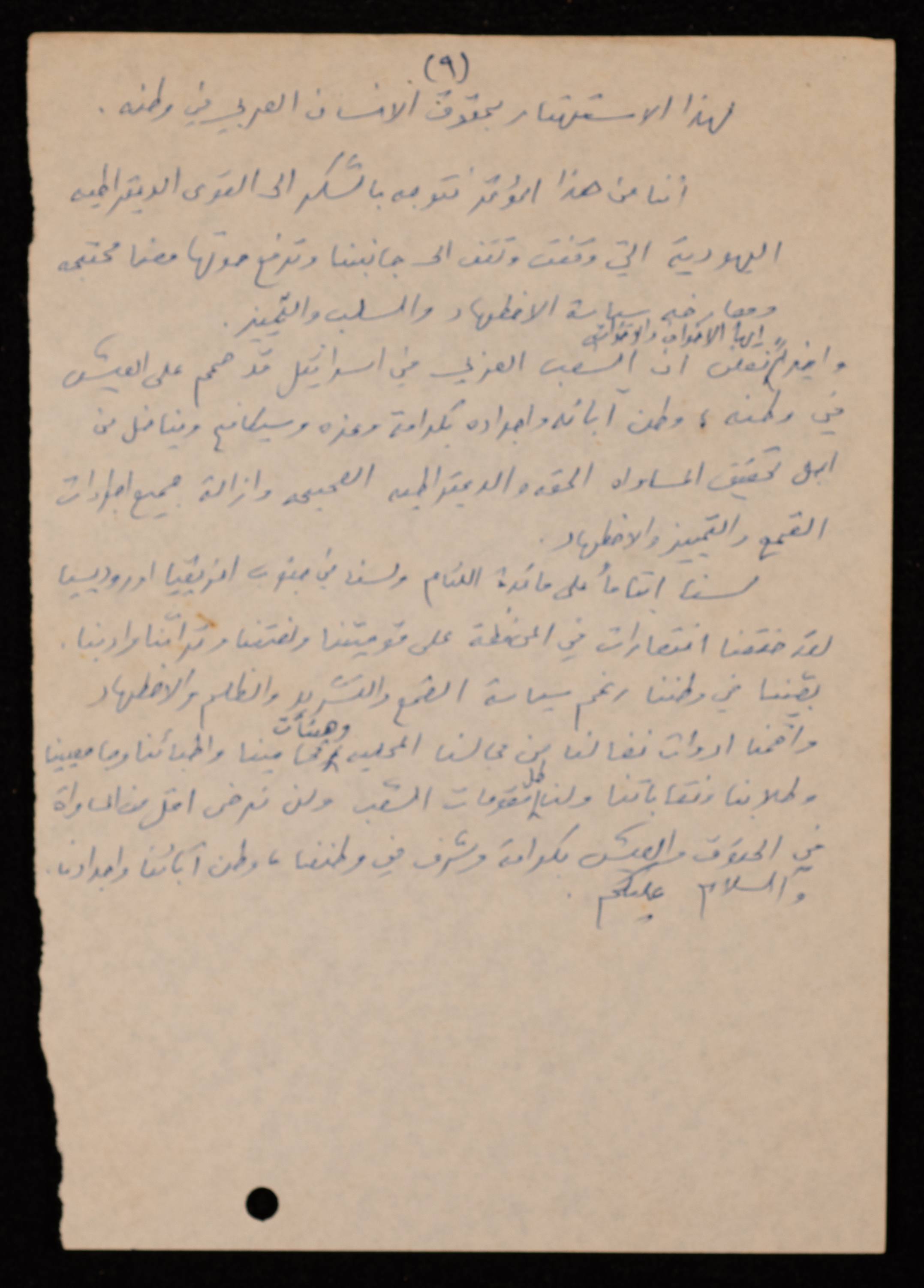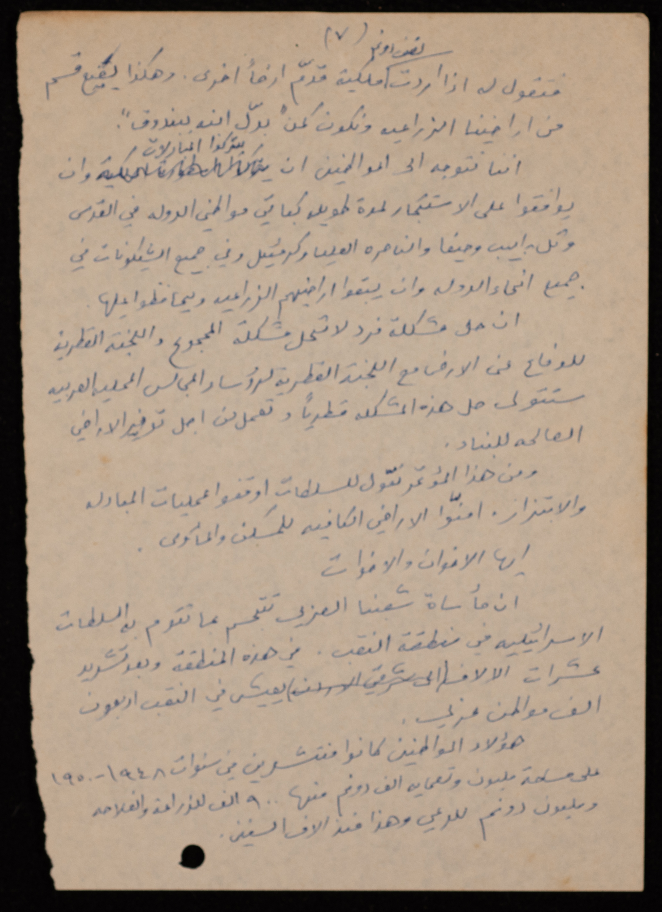 توثق هذه المادة الأرشيفية باللغة العربية والمكتوبة بخط اليد، بيان عام للمؤتمر الشعبي المنعقد في القاهرة بتاريخ 17 شباط 1979، صادر عن اللجنة القطرية للدفاع عن الأراضي.