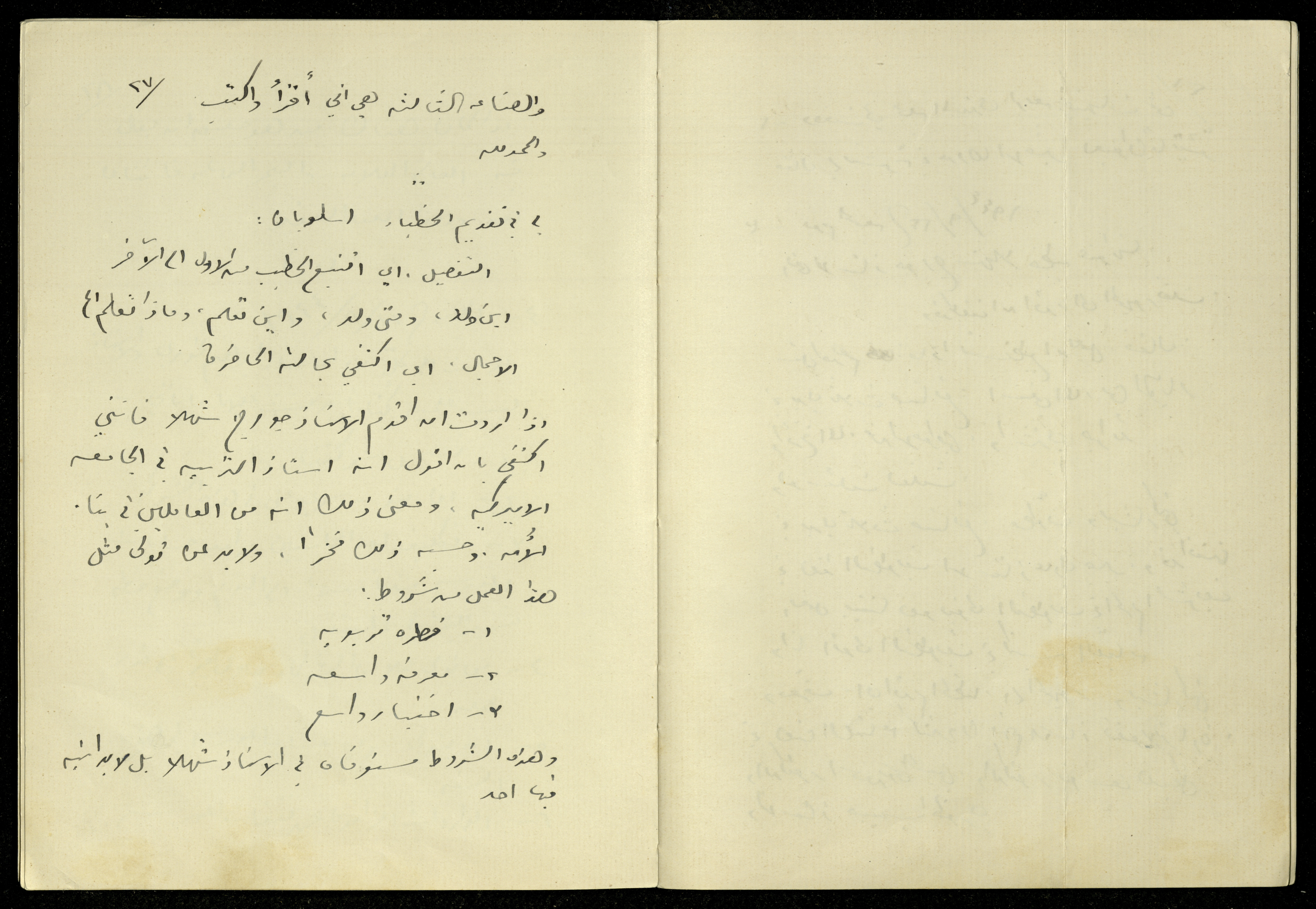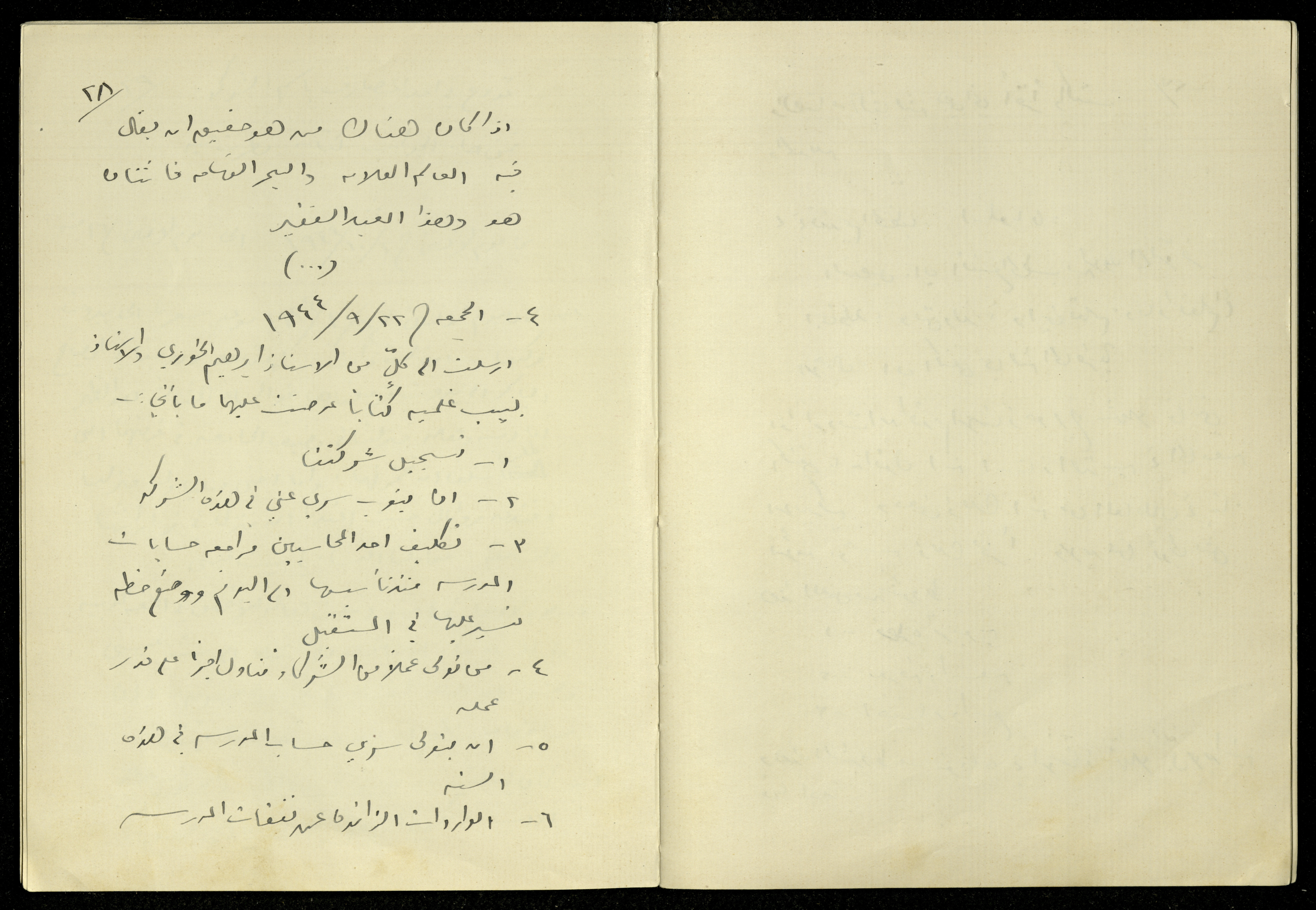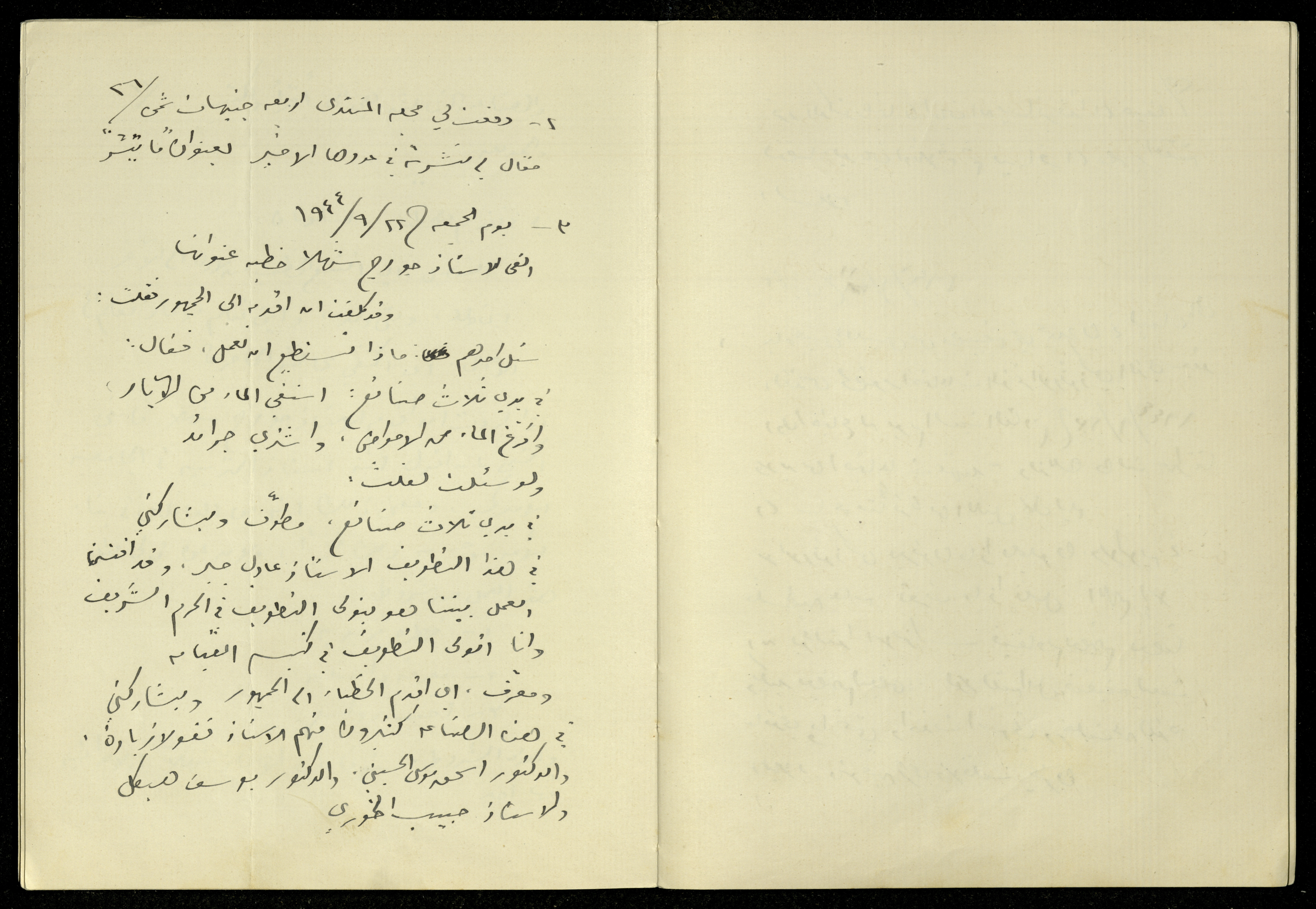 Handwritten, this archival item documents the diaries of Khalil Sakakini on Friday 22 September 1944, where he mentioned introducing George Shahla before he delivers his speech, then he spoke about his style in addressing the oratists; as it is either detailed or outlined.