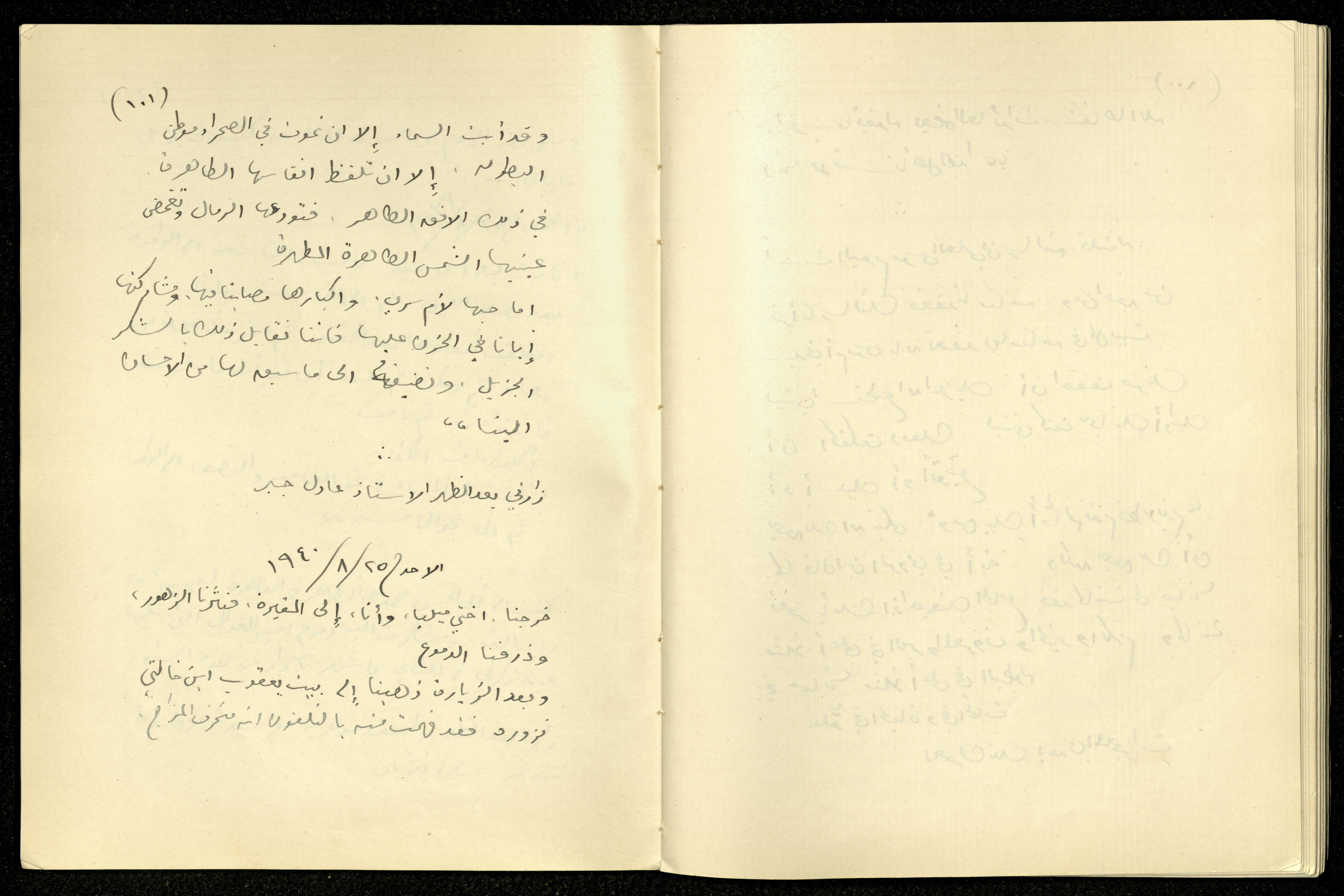 توثق هذه المادة الارشيفية المكتوبة بخط يد خليل السكاكيني يوميته المؤرخة في يوم الأحد الموافق 25 آب 1940، افتتحها بذكر خروجه هو اخته ميليا إلى المقبرة ونثرهم الزهور عليها. ومما جاء فيها أيضاً استحضار يوميته المؤرخة بنفس اليوم من العام الماضي، وذكر أن واصف جوهرية زاره بعد الظهر مع زوجته لأول مرة منذ سنتين.