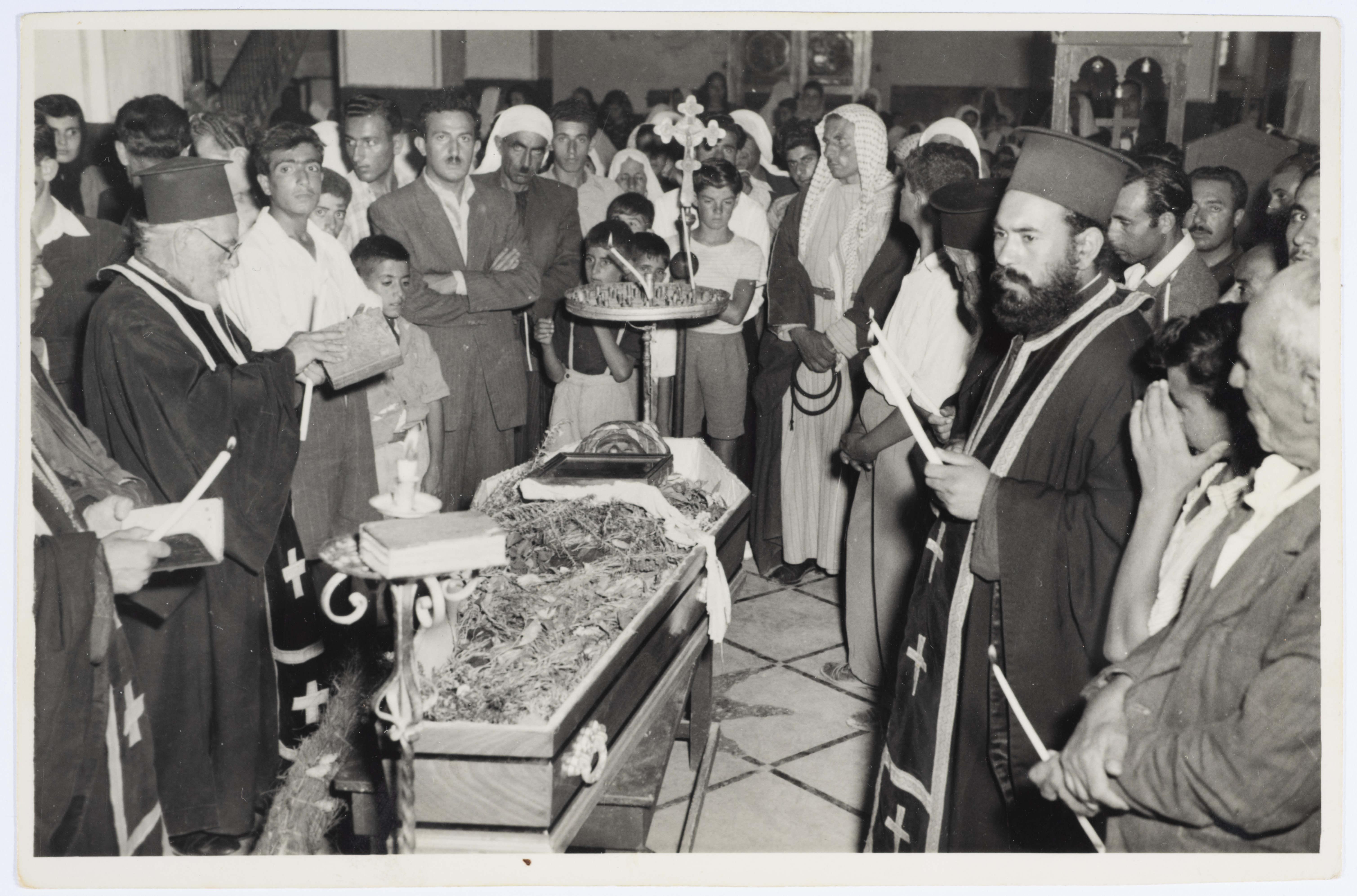 Taken in 1952 by Samaan Sahar Studio, this photograph shows the funeral ceremony of Hanna Khamis in Beit Jala, where his body is laid in an open coffin with a cross on its lid and men and women and wreaths around it. The photograph bears the signature of said Studio in al-Madbaseh Street, Bethlehem.