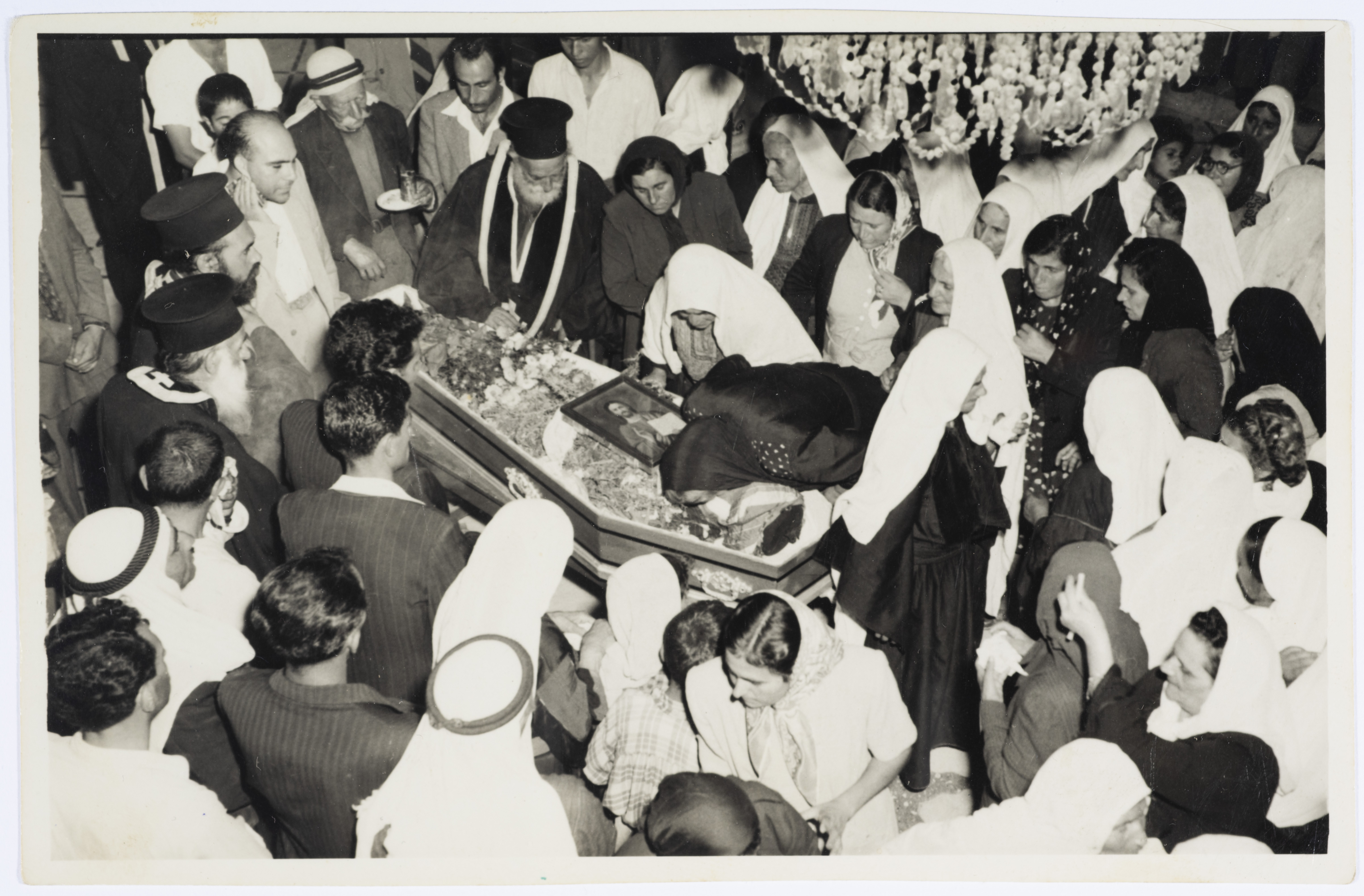 Taken in 1952 by Samaan Sahar Studio, this photograph shows the funeral ceremony of Hanna Khamis in Beit Jala, where his body is laid in an open coffin with a cross on its lid and men and women and wreaths around it. The photograph bears the signature of said Studio in al-Madbaseh Street, Bethlehem.