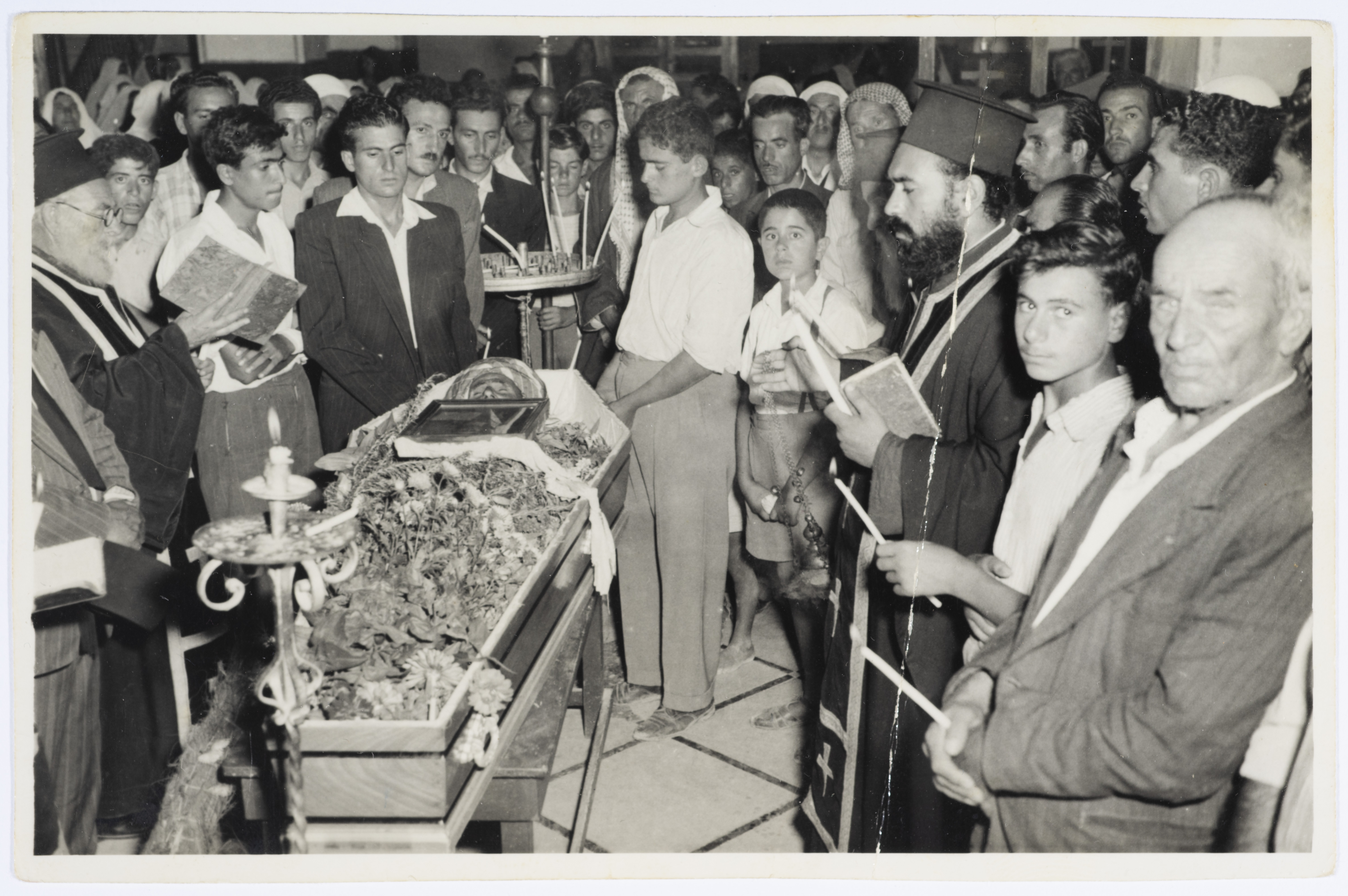 Taken in 1952 by Samaan Sahar Studio, this photograph shows the funeral ceremony of Hanna Khamis in Beit Jala, where his body is laid in an open coffin with a cross on its lid and men and women and wreaths around it. The photograph bears the signature of said Studio in al-Madbaseh Street, Bethlehem.