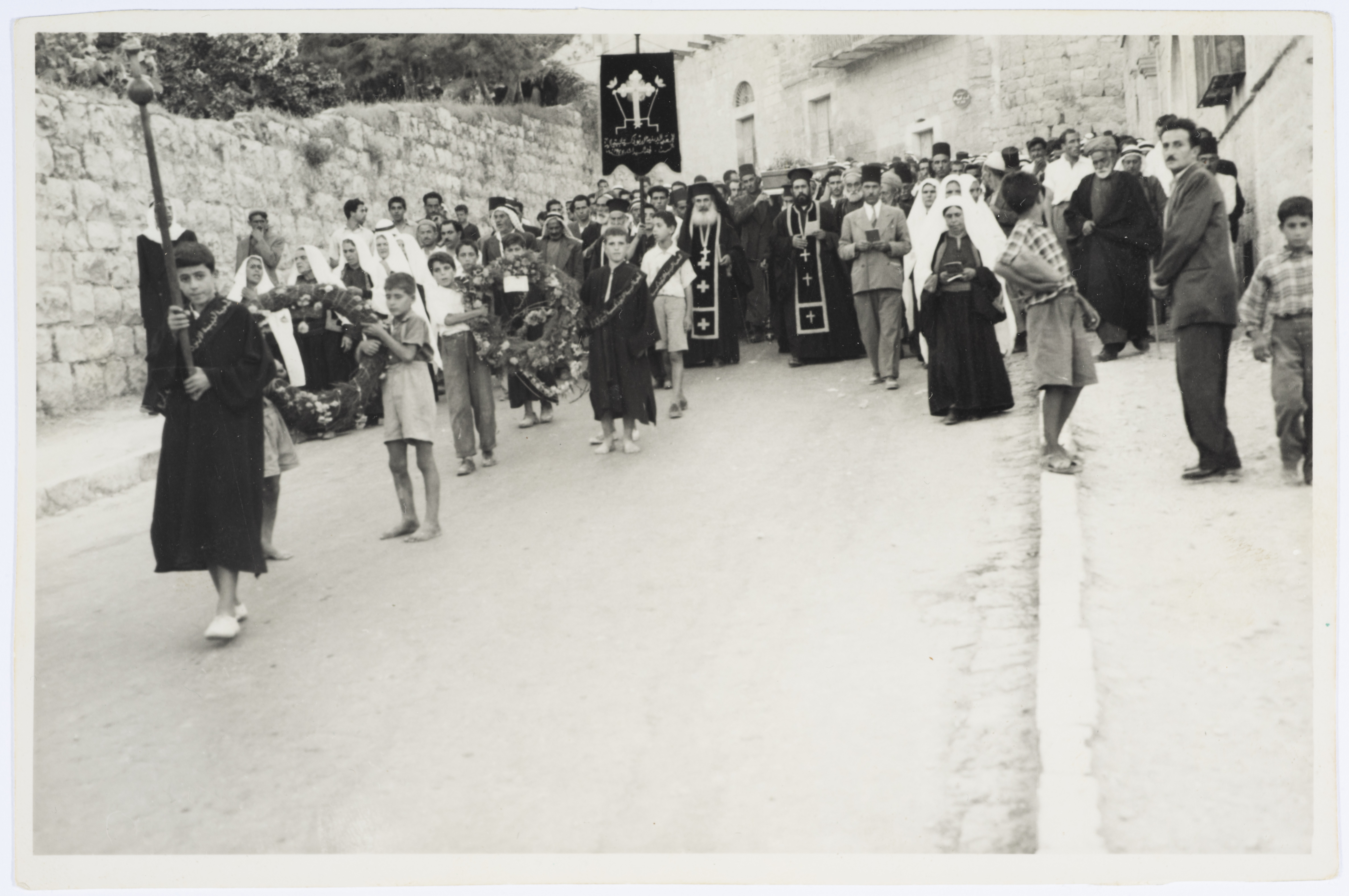 Taken in 1952 by Samaan Sahar Studio, this photograph shows the funeral ceremony of Hanna Khamis in Beit Jala, where pallbearers are seen carrying the coffin on their shoulders with men and women around it and children with flowers leading the ceremony. The photograph bears the signature of said Studio in al-Madbaseh Street, Bethlehem.