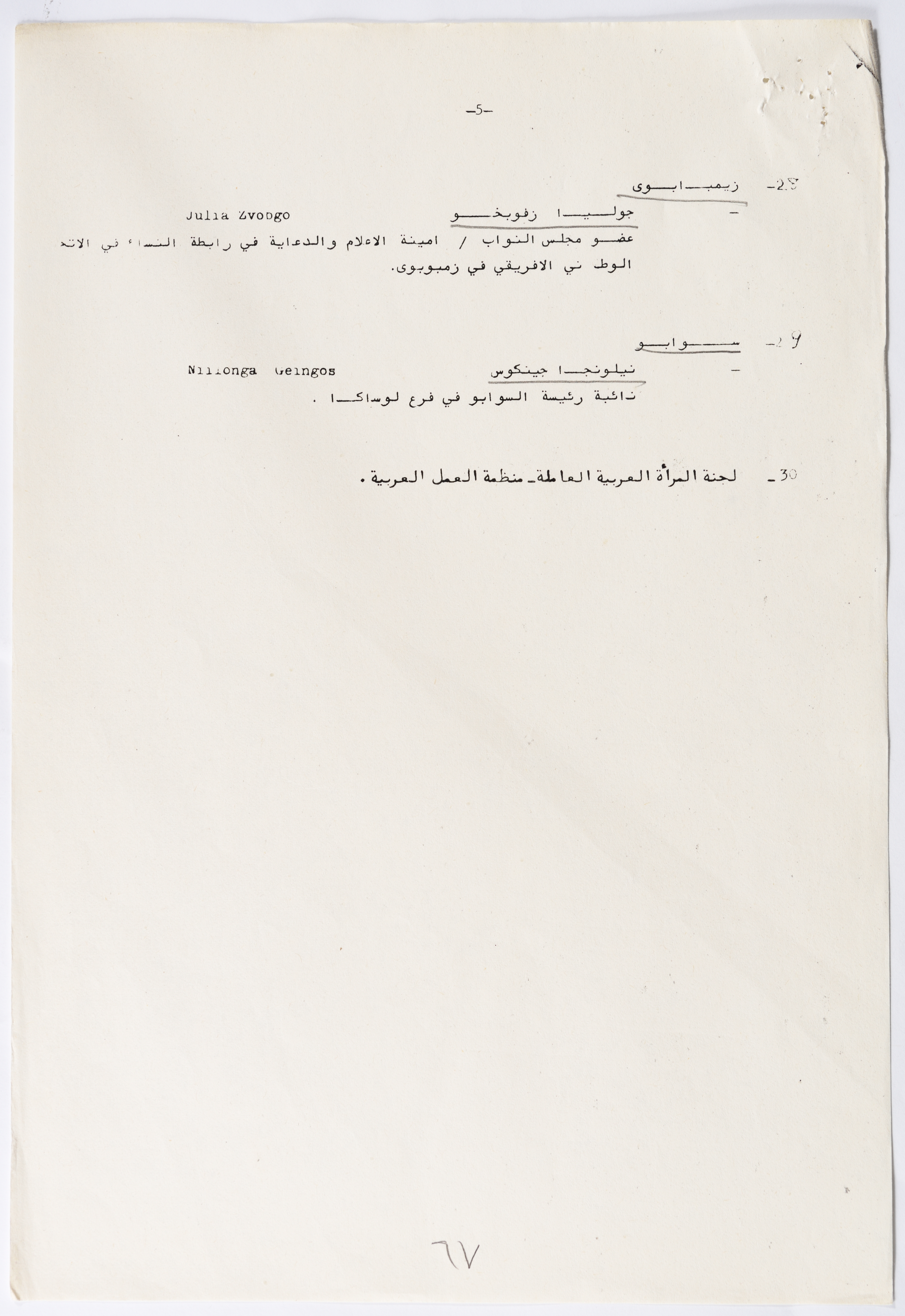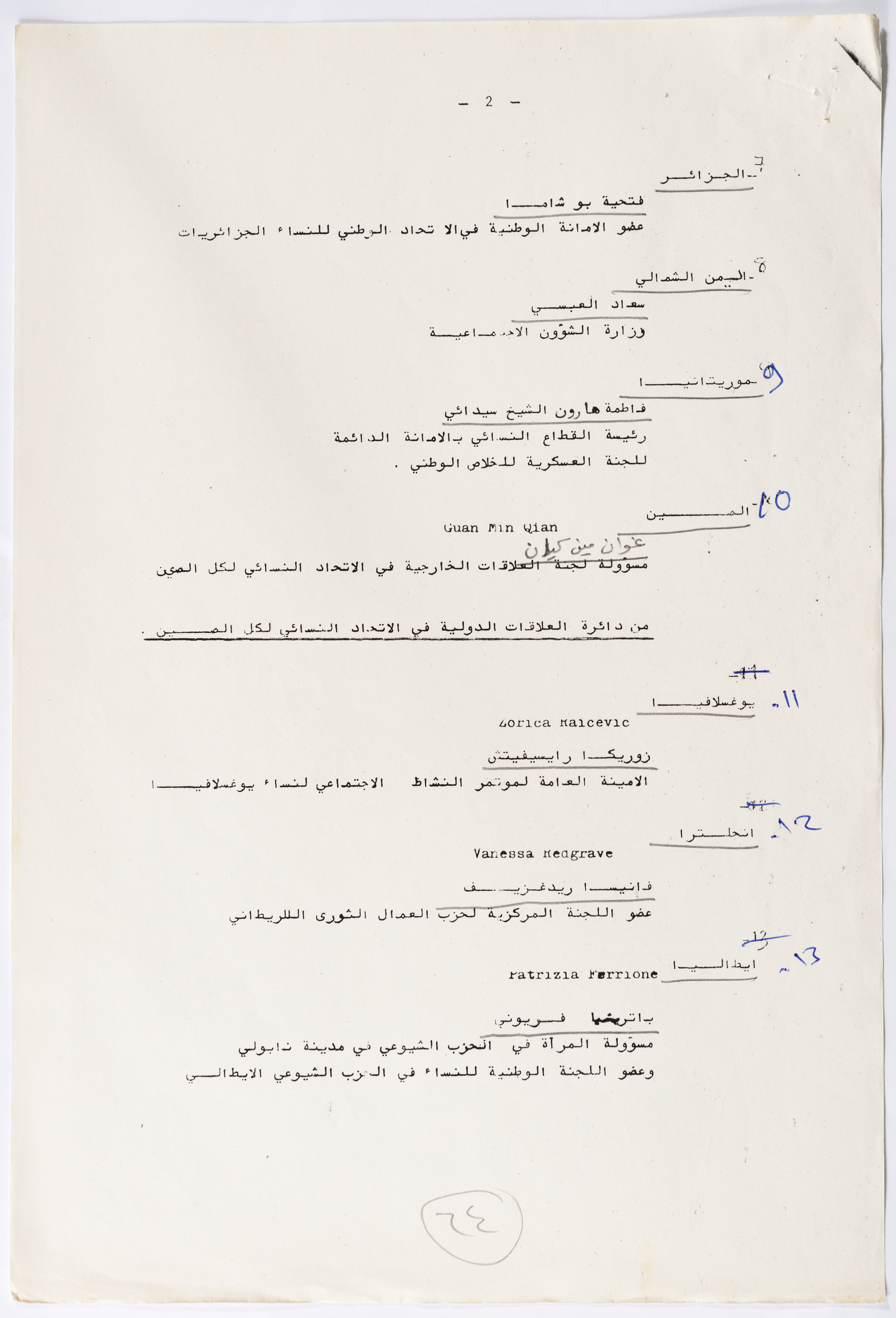 قائمة بأسماء وأعضاء الوفود المشاركة في المؤتمر العام الرابع للاتحاد العام للمرأة الفلسطينية عام 1985 في تونس.
