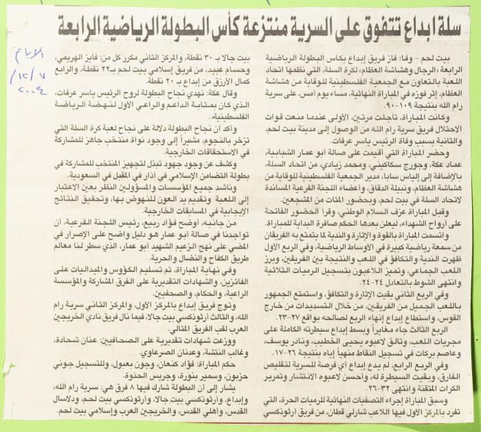 قصاصة من جريدة الأيام الصادرة باللغة العربية بتاريخ 7 كانون الأول 2004 تتضمن خبر بعنوان "سلة ابداع تتفوق على السرية منتزعة كأس البطولة الرياضية الرابعة"، حيث فاز فريق ابداع على فريق سرية رام الله بنتيجة 109 مقابل 90.