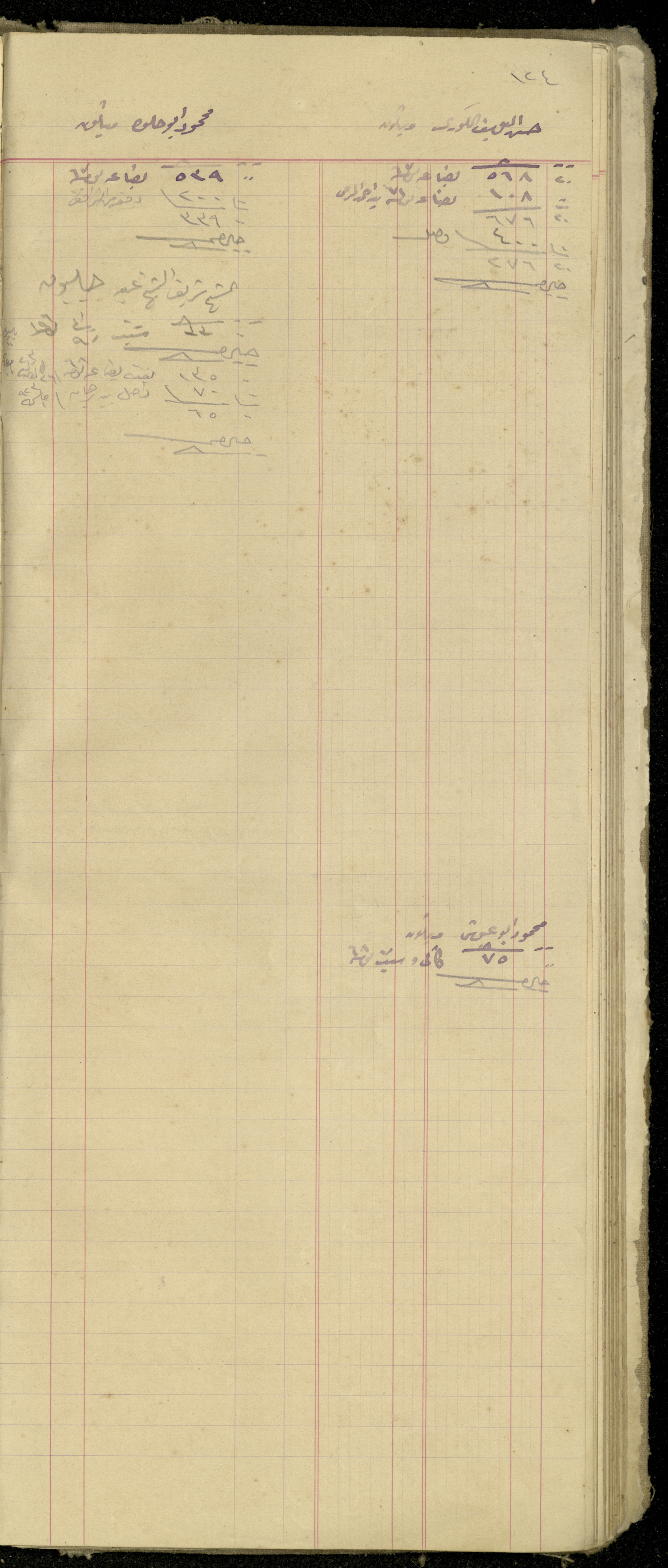 Handwritten in Arabic, this archival item shows a document from the debt book of Fouad Abdel-Hadi, which he started writing on 20 June 1920, where he handwrote debt accounts for Hasan Kouri and Mahmoud abu Helweh from Meithalun in Jenin.