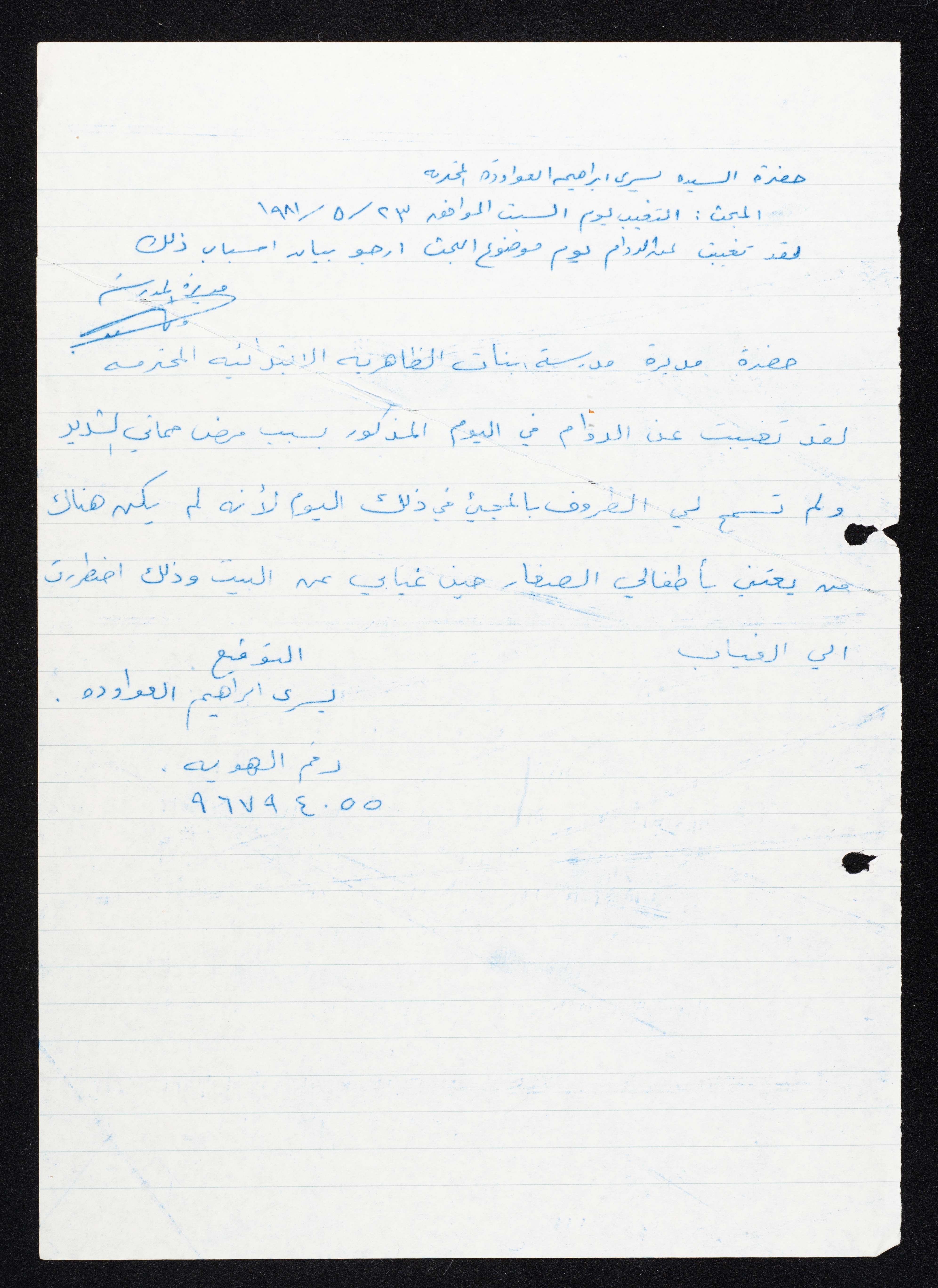 تتضمن هذه الوثيقة المكتوبة بخط اليد رسالة من مديرة مدرسة بنات الظاهرية الابتدائية إلى يسرى العواودة بتاريخ 23 أيار 1981 تطلب فيها تبرير سبب التغيب عن الدوام كما تتضمن رد العواودة بأن سبب التغيب عن الدوام في اليوم المذكور هو مرض والدة زوجها فلم يكن هناك من يعتني بأطفالها الصغار.