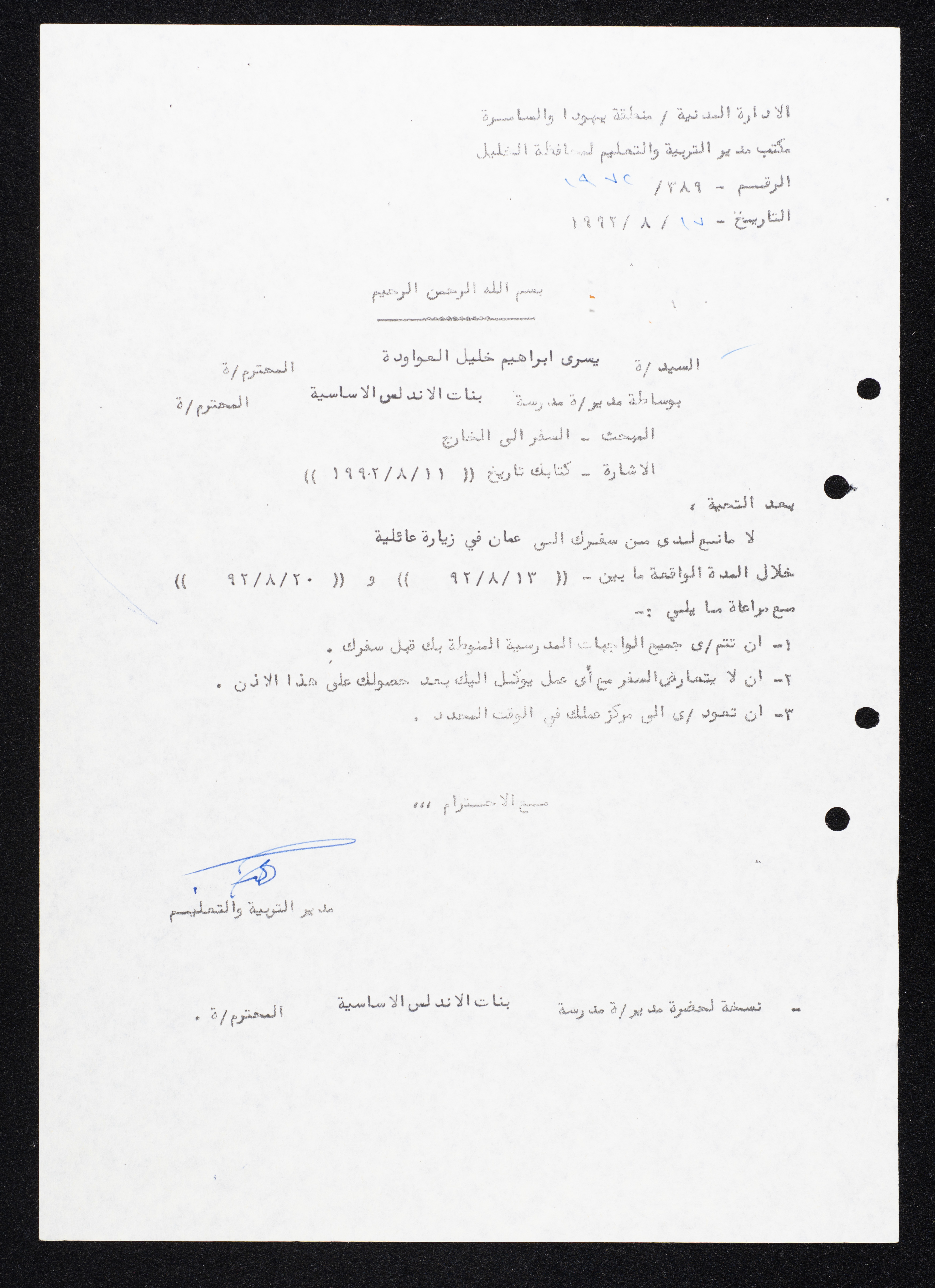 This document includes a letter of approval from the Director of Education for the Hebron Governorate for the travel of Yousra Ibrahim Khalil Awawdeh by the headmistress of al-Andalus Girls School on 17 August 1992 to Jordan during the period between 13 and 20 August 1992, taking into account the completion of all the school duties entrusted to her before the travel, and that it does not conflict with any work entrusted to her after obtaining this permission and to return to her workplace at the specified time.