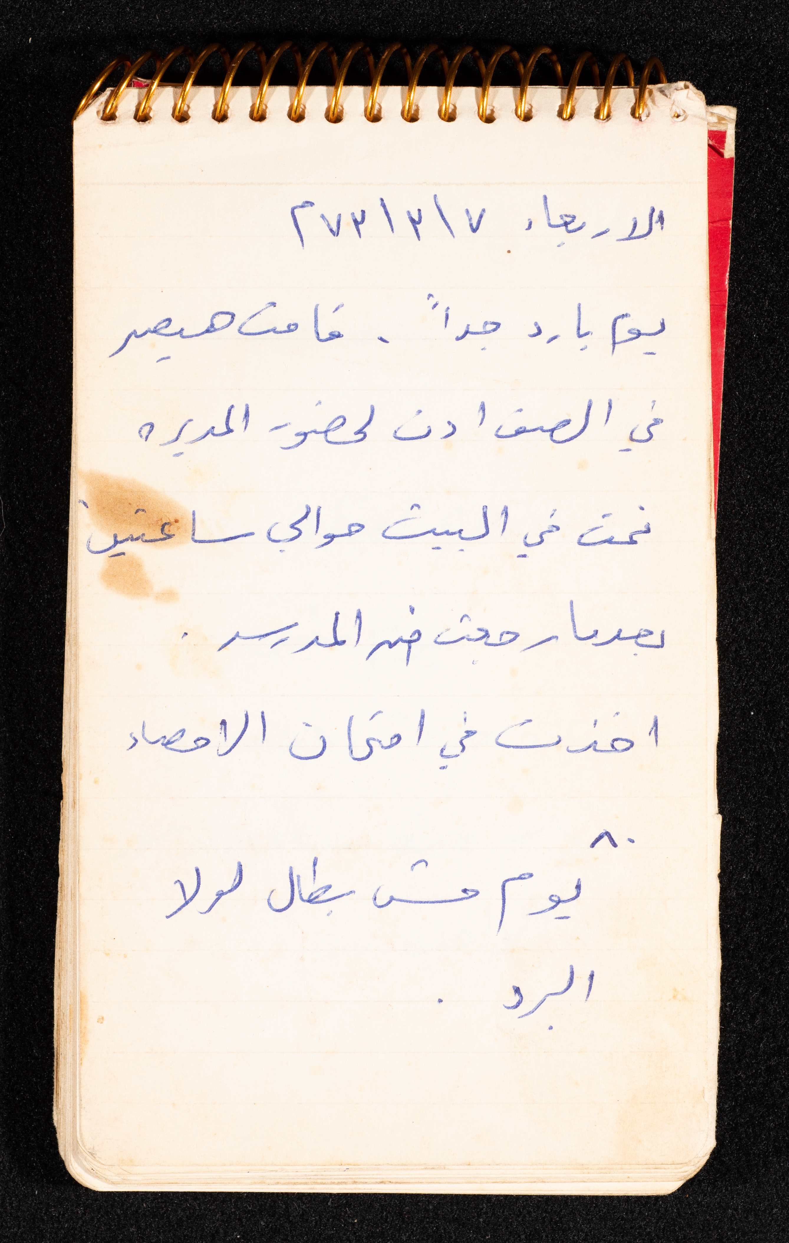Handwritten in Arabic on Wednesday 7 March 1973, this document shows the diaries of Yousra Ibrahim Khalil Awawdeh in her notebook, where she mentioned the cold weather on that day, noises made by the students which made the principal come to the classroom, she also mentioned getting 80% in statistics and sleeping for a couple of hours after returning from school.