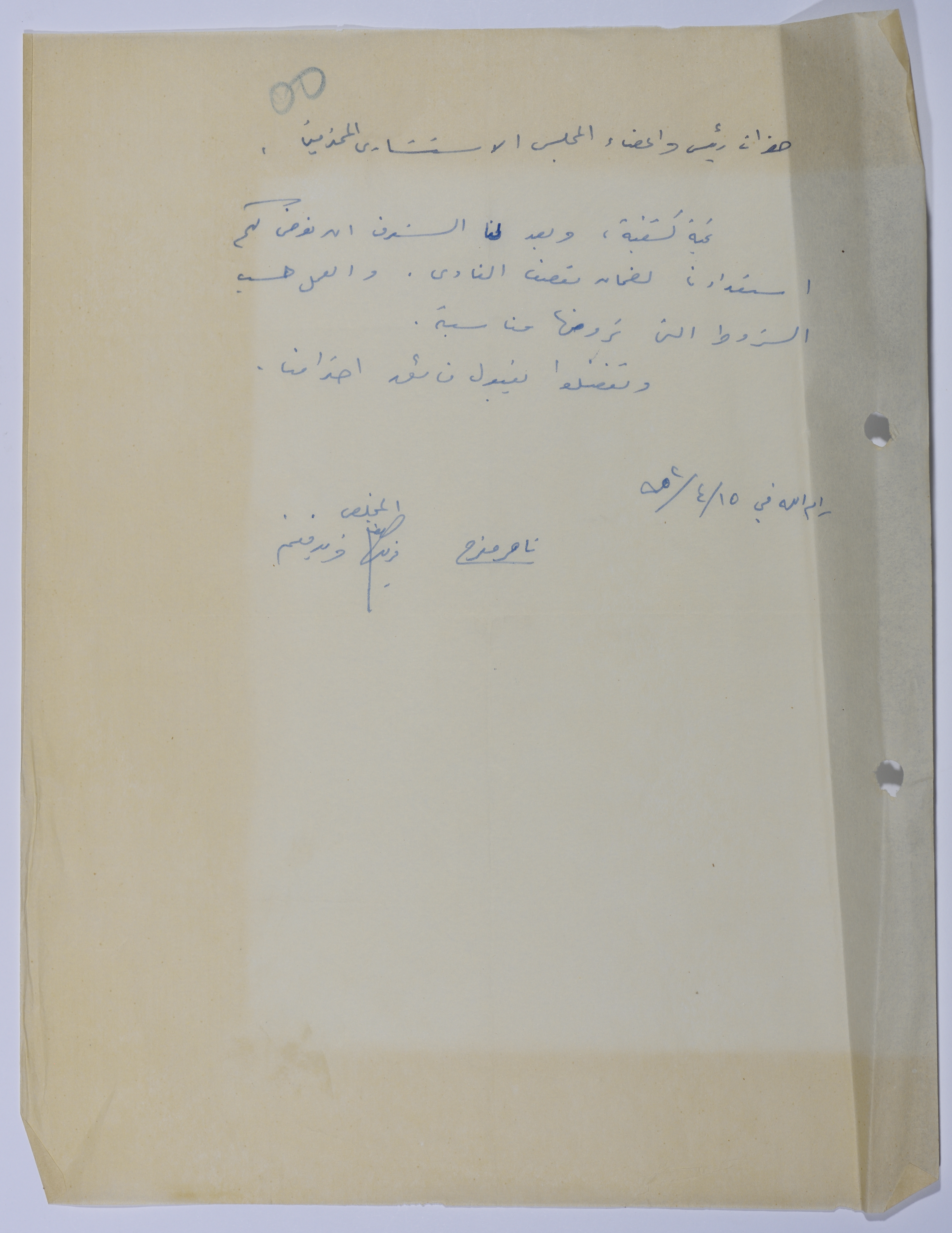 رسالة من ناصر مفرح وفريد مغنم توضح استعدادهم لضمان مقصف السرية. الرسالة بخط اليد وموجهة لرئيس واعضاء المجلس الاستشاري للسرية.