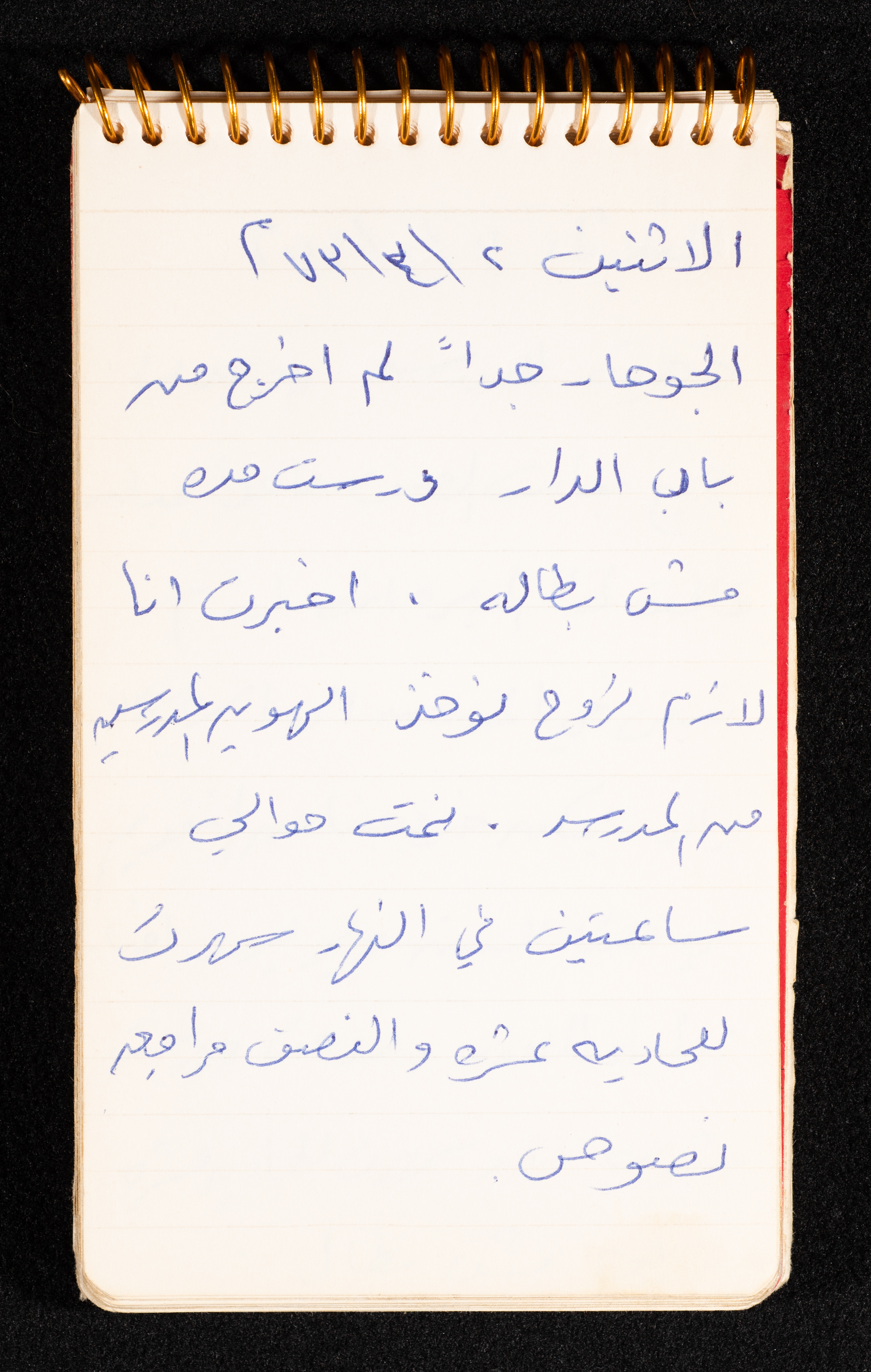 Handwritten in Arabic on Monday 2 April 1973, this document shows the diaries of Yousra Awawdeh in her notebook, where she mentioned the hot weather, staying home on that day, studying for a while, sleeping for about 2 hours during the day, staying up late until 11:30 pm revising Arabic, and realizing that she has to go to bring her school I.D.