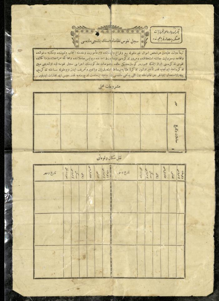 شهادة ميلاد عثمانية لعبد الرحمن محمد سعيد السفاريني، المولود في طولكرم بتاريخ 28 كانون الأول 1905، صادرة عن دائرة النفوس في مركز قضاء بني صعب التابع لولاية بيروت، وفقًا للتقسيم الإداري في الدولة العثمانية، بتاريخ 4 ذو القعدة 1323 الموافق 31 كانون الأول 1905، ووقعت بتوقيع مأمور النفوس في منطقة بني صعب وطابعًا عثمانيًا.