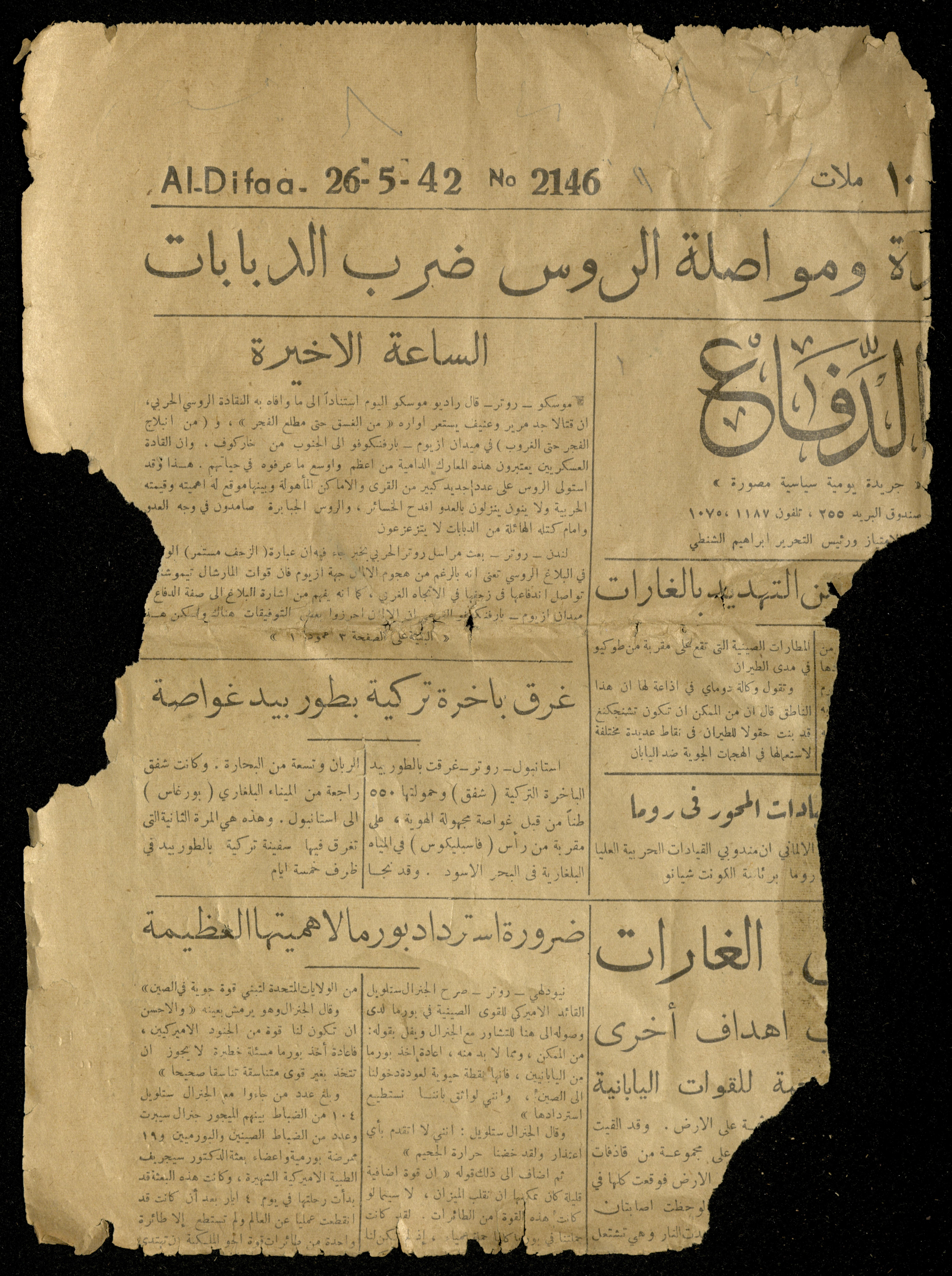 قصاصة من جريدة الدفاع ضمن العدد رقم 2146 الصادر في 26 أيار 1942، والتي كانت تباع بسعر عشرة ملات. احتوت القصاصة على عدد من العناوين مثل "الساعة الأخيرة" و"غرق باخرة تركية بطوربيد غواصة" و"ضرورة استرداد بورما لأهميتها العظيمة" و"شؤون التموين" و"تدريب أطباء على إسعاف جرحى الغارات" و"دواليب السيارة وضرورة إصلاحها".