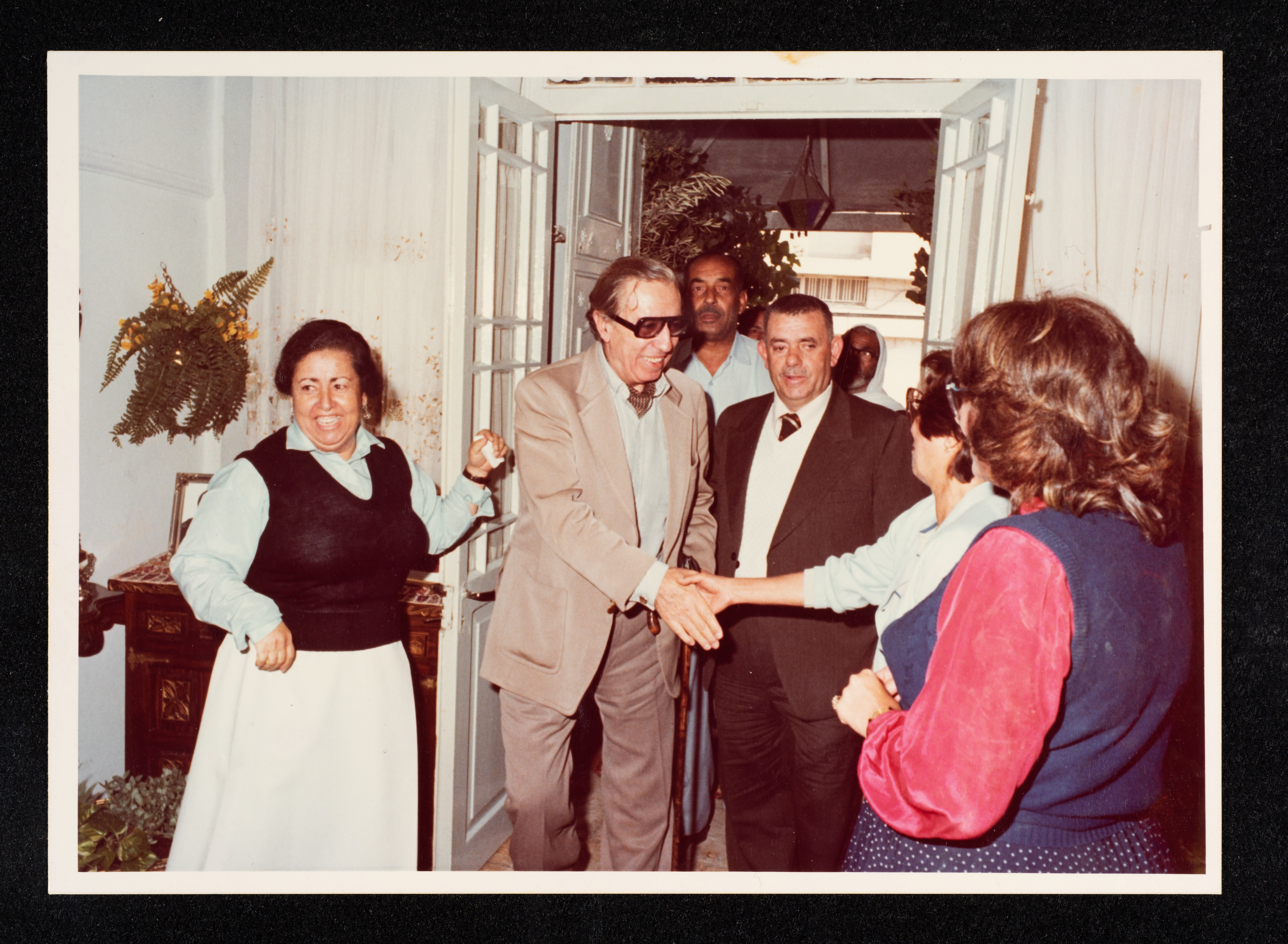 Taken in 1984, this photograph shows Anwar Zaki Nusseibeh wearing sunglasses, on his right his sister Samah, on his left his friend Abu Faris Hijazi, and the family friend Bakiza "Immam" Nashashibi where her back is facing the camera on the far right of the photograph. This photograph was taken after Nusseibeh's return home after Hajj, at his house in the Sheikh Jarrah Neighbourhood in Jerusalem.