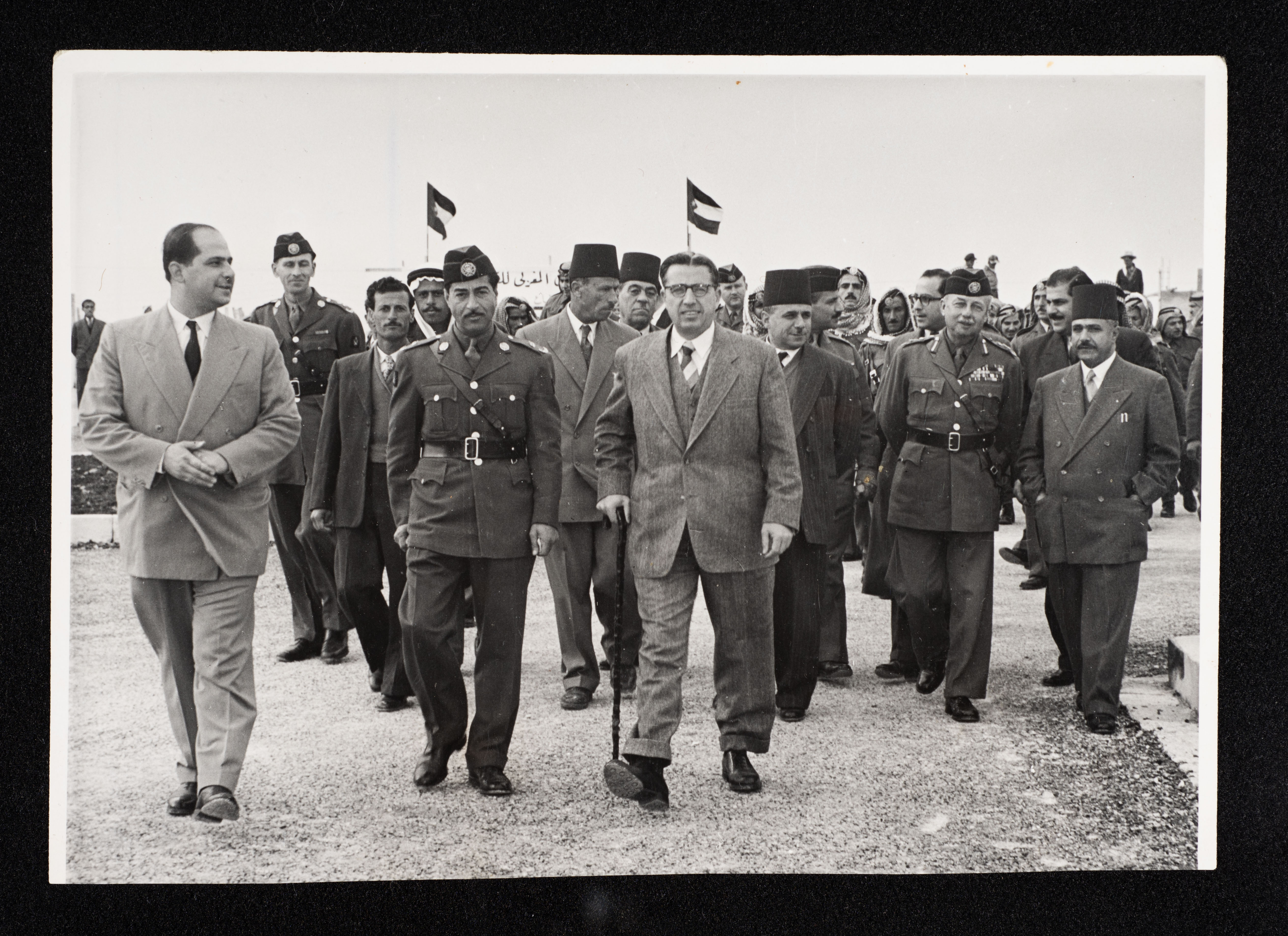 Taken in the 1950s, this group portrait shows Anwar Nusseibeh during his tenure as Minister of Defence at the Hashemite Kingdom of Jordan accompanied by members of the Jordanian Armed Forces.