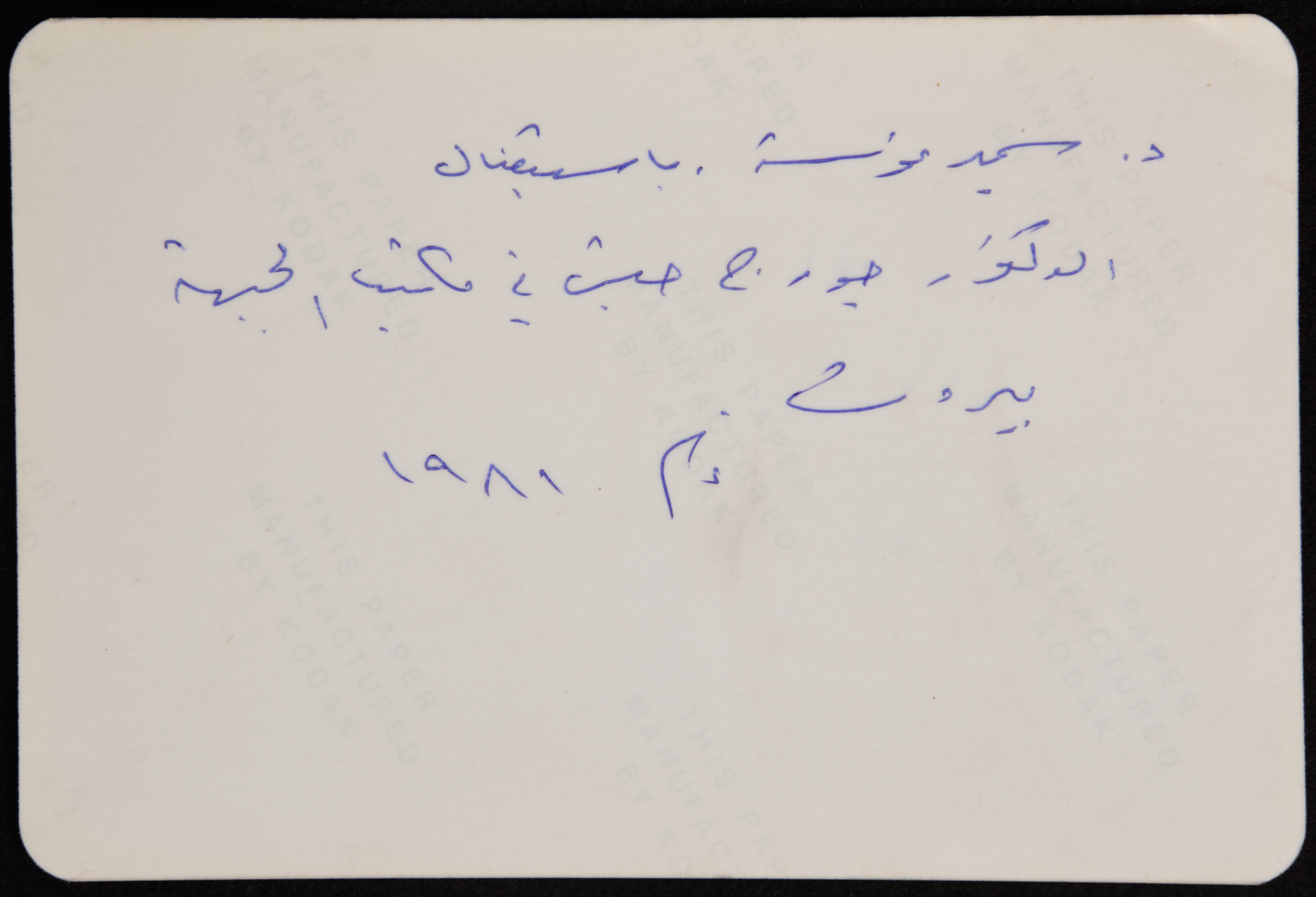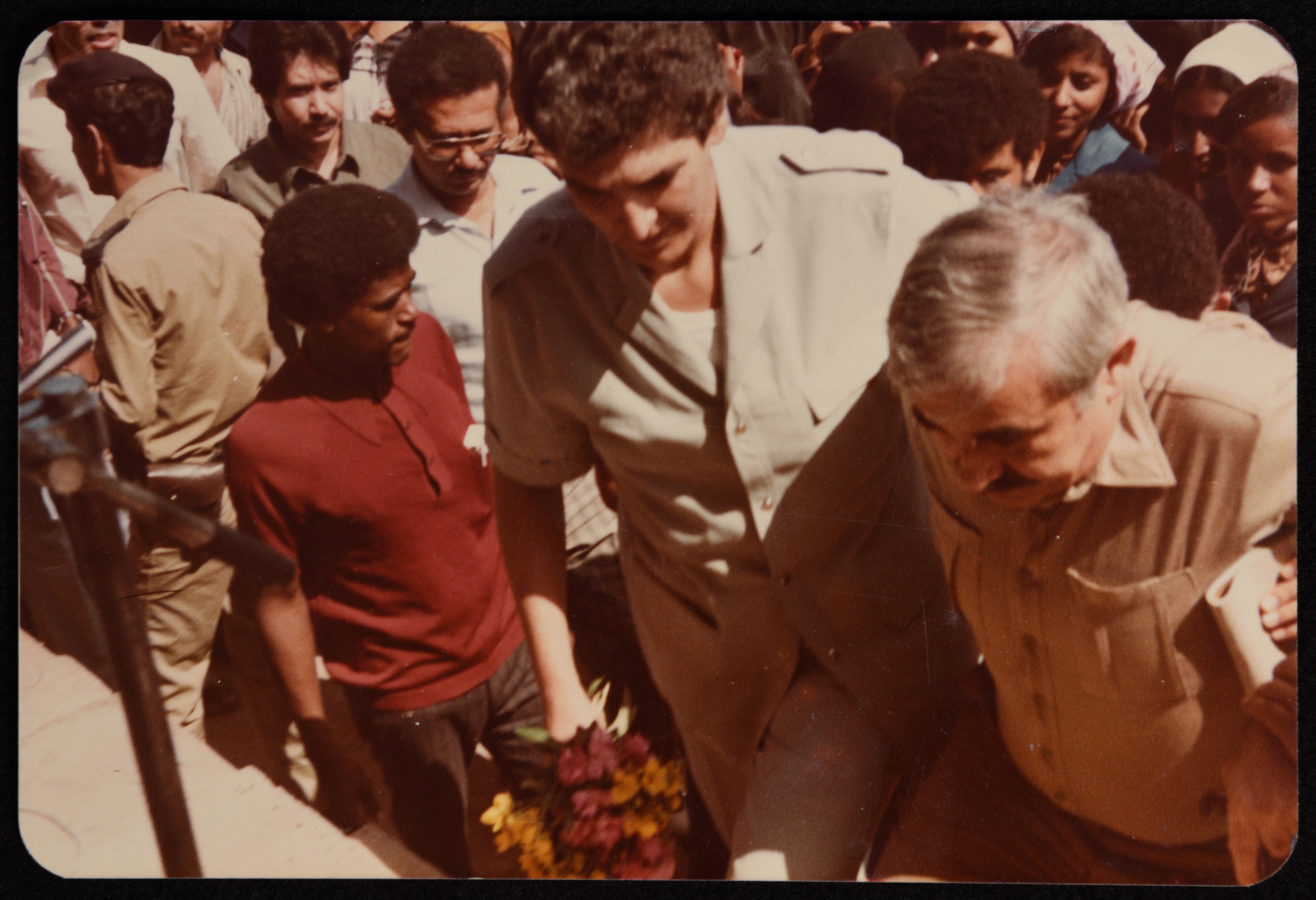 صورة ملونة يظهر فيها الدكتور سمير غوشة وهو يستقبل الدكتور جورج حبش في مكتب جبهة النضال الشعبي الفلسطيني في بيروت عام 1981