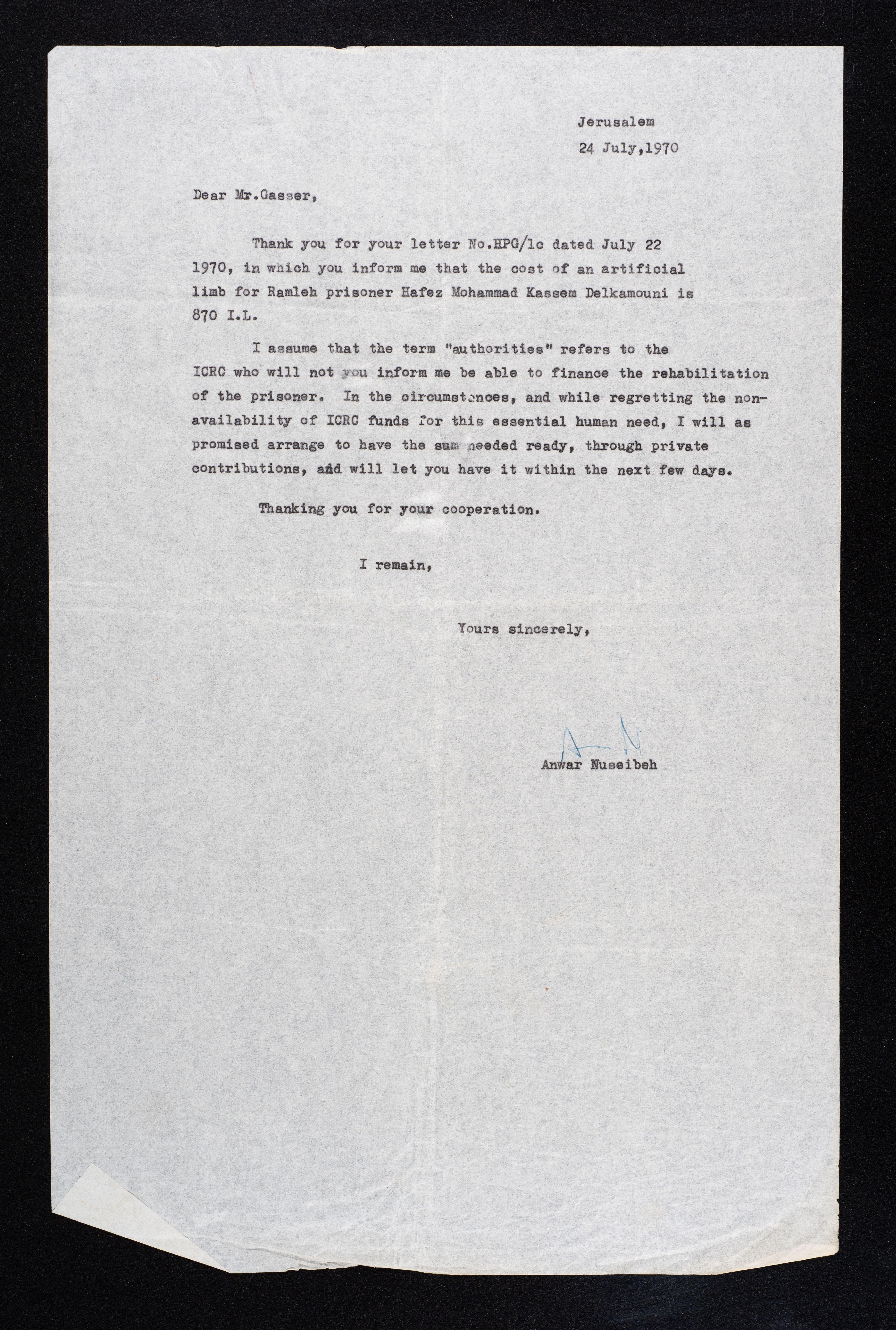 رسالة مطبوعة باللغة الانجليزية من أنور نسيبة في القدس إلى جاسر ومرسلة بتاريخ 24 تموز 1970، يرد من خلالها نسيبة على رسالة واردة بتاريخ 22 تموز 1970 بخصوص تجميع مبلغ من المال والتبرع بطرف صناعي للأسير حافظ قاسم المسجون في سجن الرملة.