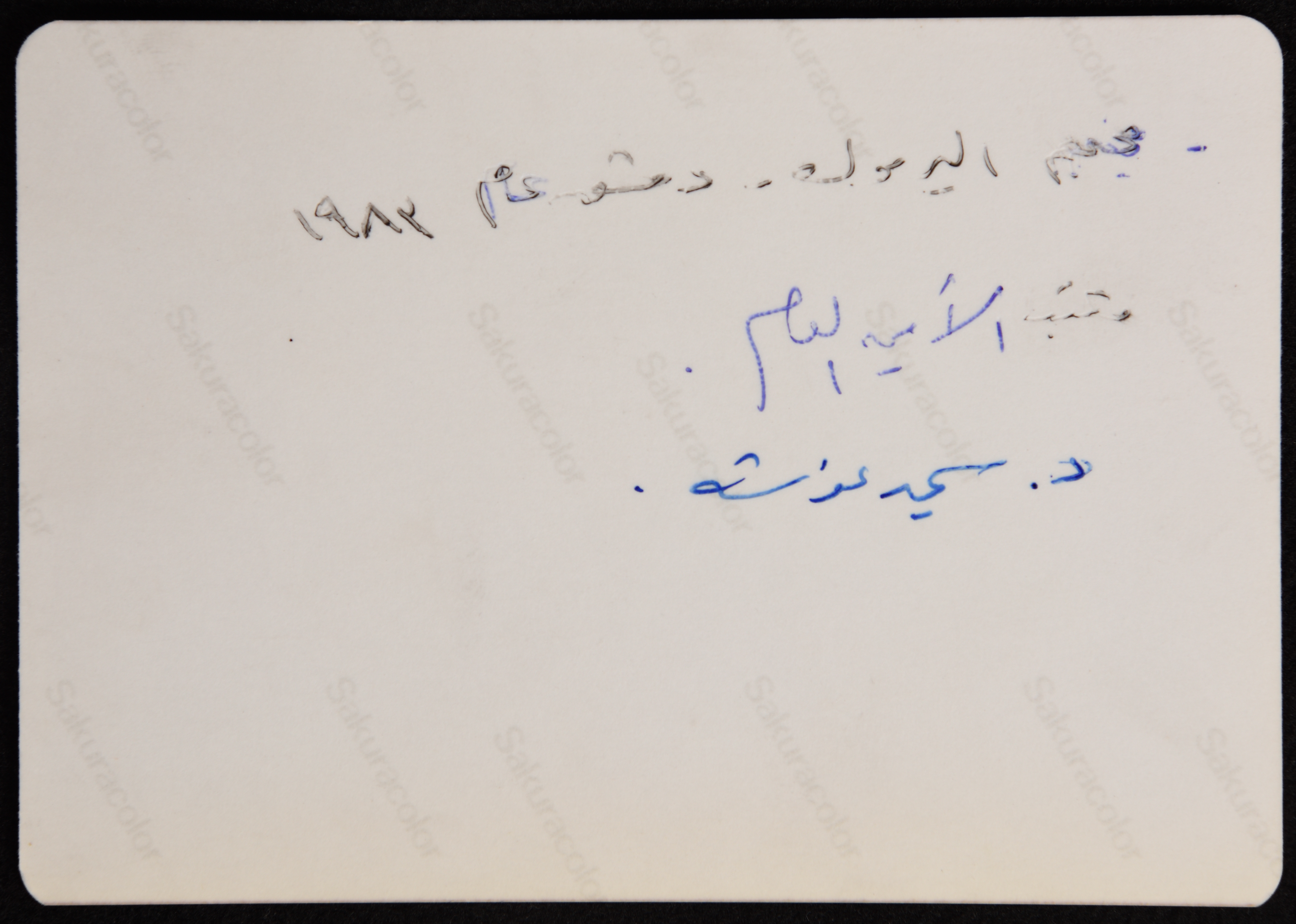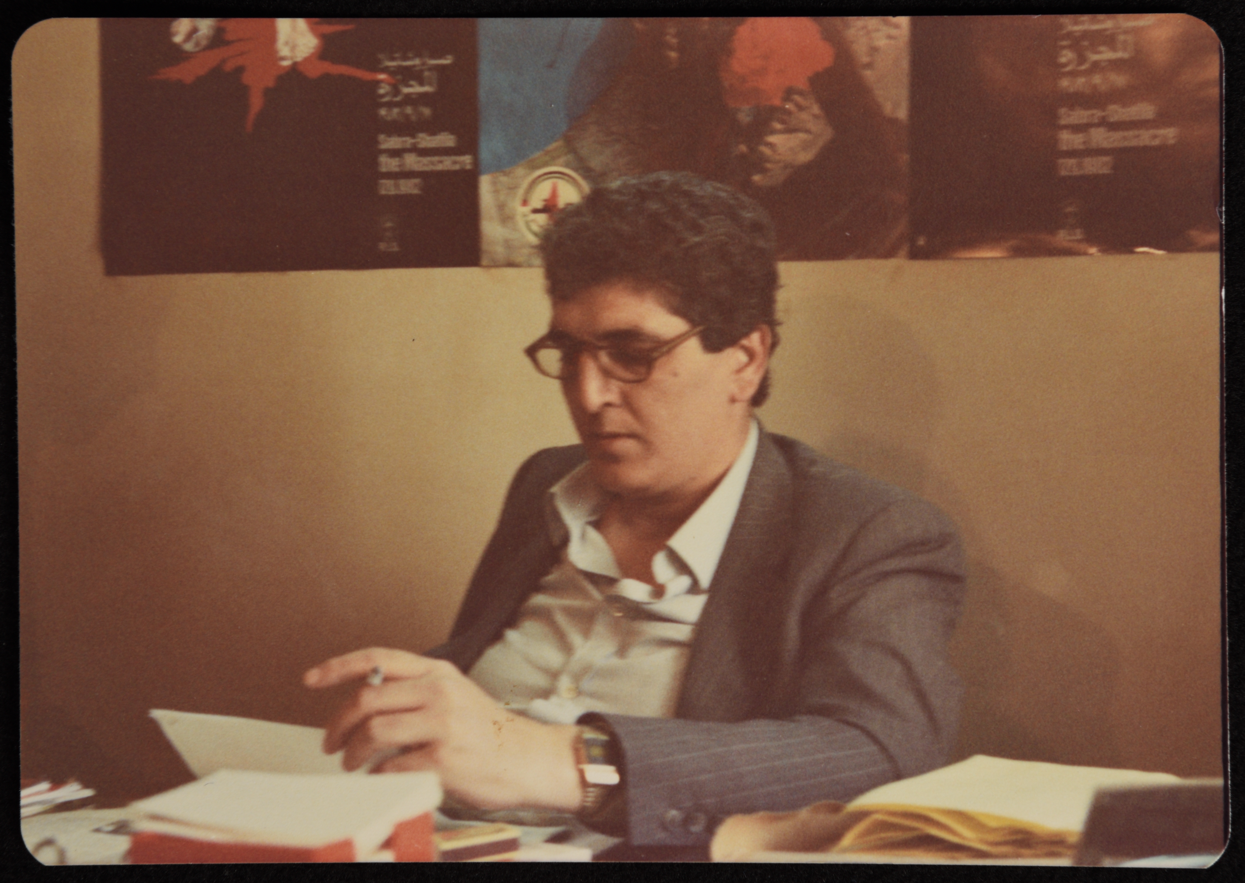 صورة ملونة يظهر فيها الدكتور سمير غوشة وهو جالس في مكتبه في مخيم اليرموك في دمشق عام 1983