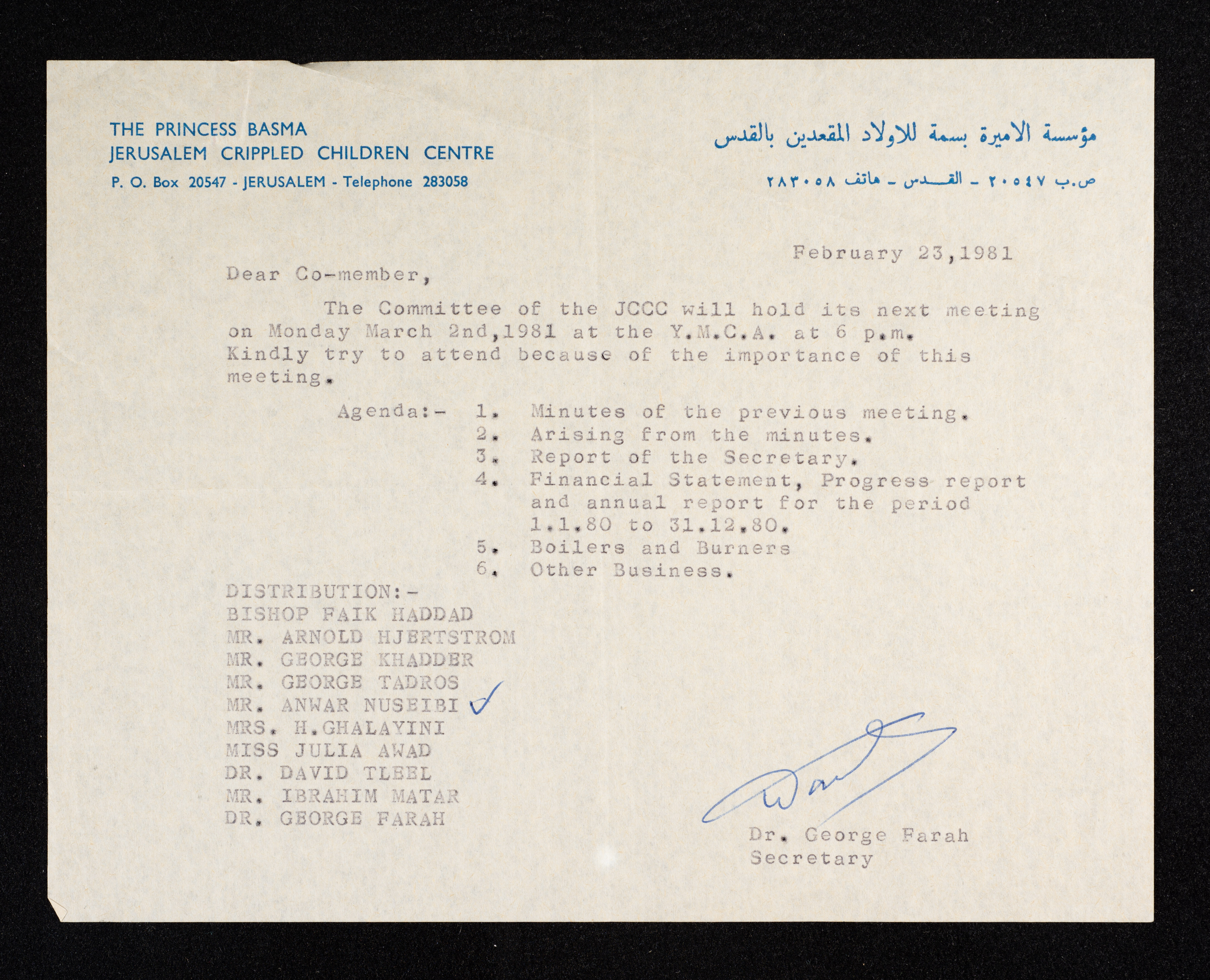 طبعت باللغة الإنجليزية، تعكس هذه الوثيقة رسالة من د. جورج فرح في مركز الأميرة بسمة للأولاد المقعدين في القدس إلى أنور نسيبة، المرسلة بتاريخ 23 شباط 1981 يدعوه فيها إلى حضور الاجتماع القادم الخاص بلجنة الأطفال المقعدين في القدس وذلك يوم الاثنين، الموافق 2 آذار 1981 في جمعية الشبان المسيحيين في القدس، وعليه يتمنى حضور نسيبة لأهمية هذا الاجتماع ويرفق فيها أمساء الأشخاص الذين تم توجيه الدعوة لهم كذلك الأمر، فيما كانت أجندة الاجتماع على الشكل التالي: - محضر الاجتماع السابق. - الانتهاء من هذا المحضر. - تقرير السكيرتاريا الخاص باللجنة. - ملخص مالي، تقرير سير العمل و التقرير السنوي الشامل للفترة ما بين 1-1-1980 و 31-12-1980. - مواضيع متفرقة