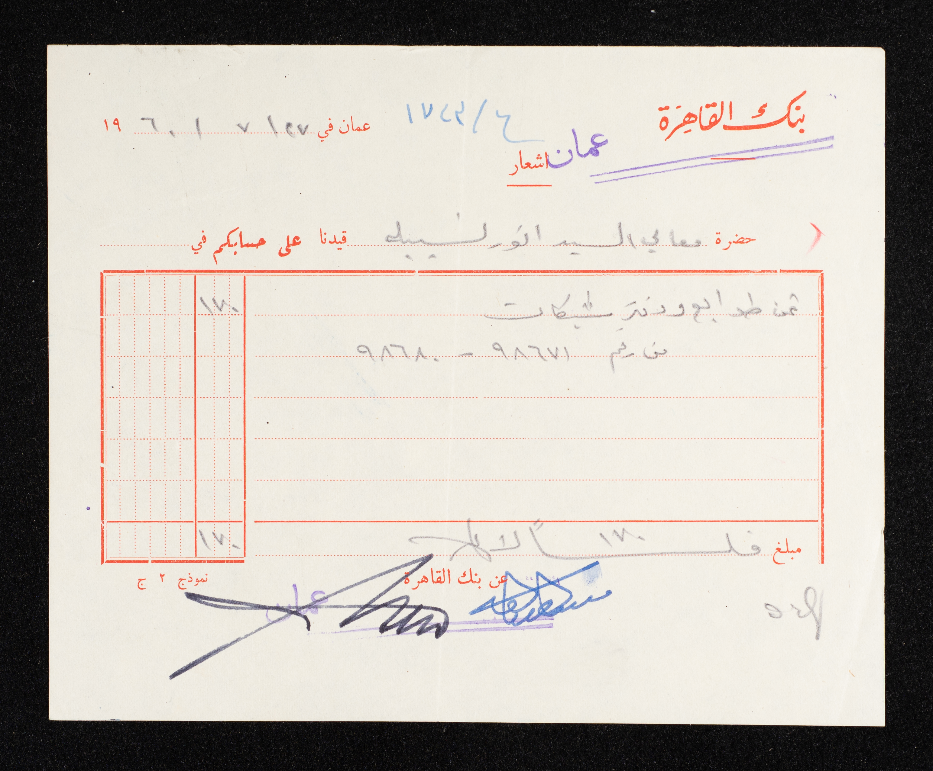 Issued in Arabic by Banque du Caire on 27 July 1960, this notice is addressed to Anwar Nusseibeh, where the bank states that it has credited a custodian of 170 fils, which is the price of stamps and a chequebook.